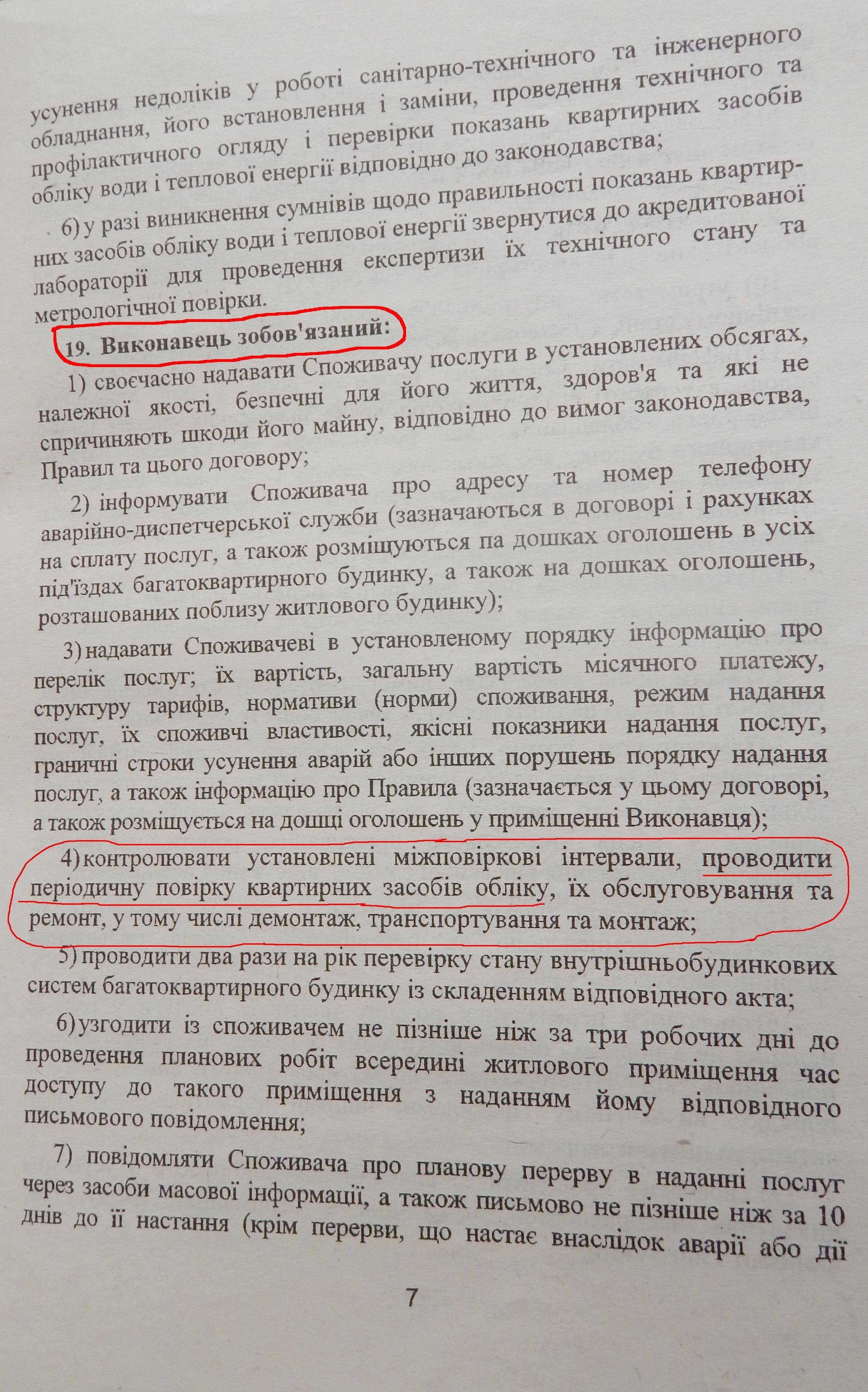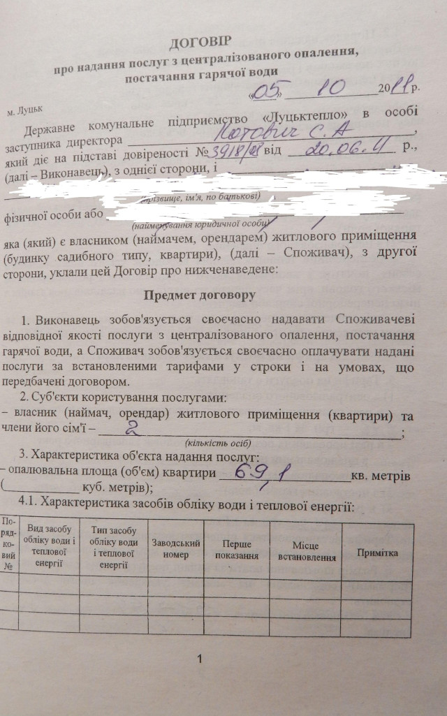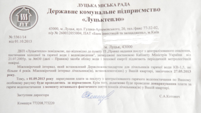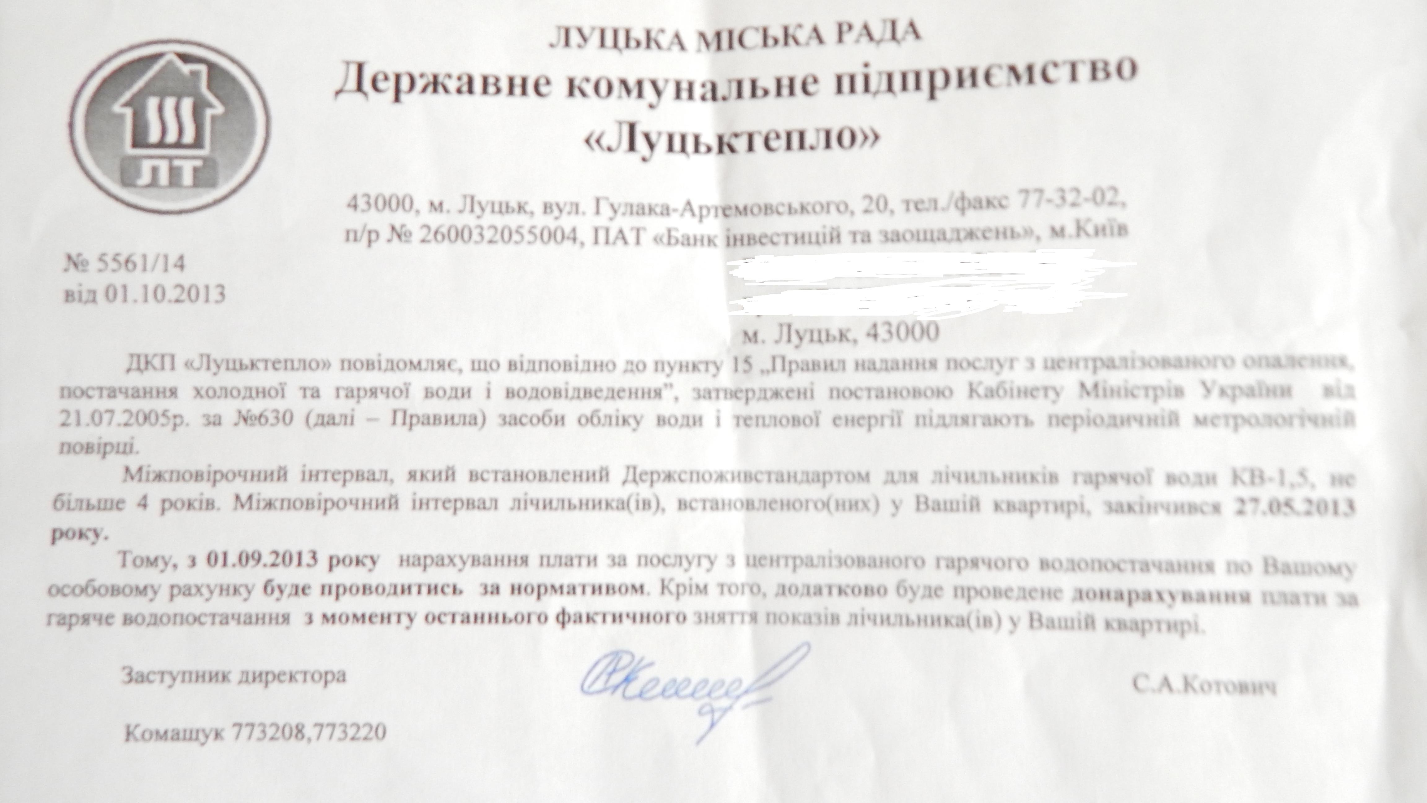 Мешканка Луцька Олена Ковальчук з обуренням каже, що за останні 2 роки з моменту підписання договору про надання послуг з централізованого опалення і постачання гарячої води це було перше повідомлення, у якому жінку поставили перед фактом, що вона не пройшла повірку лічильника. Також їй повідомили, що додатково донарахують плату за гаряче водопостачання з моменту останнього фактичного зняття показів лічильника в квартирі, не зазначивши на це підстави.