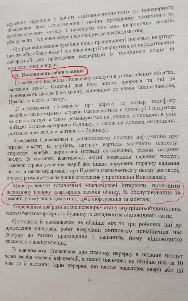 Поряд із невиконанням цього закону «Луцьктепло», на думку Олени Ковальчук, не дотримується Правила надання послуг з централізованого опалення, постачання холодної та гарячої води і водовідведення, затверджених постановою КМУ №630 від 21.07.2005. «Ці правила передбачають, що періодична повірка, обслуговування та ремонт (зокрема, демонтаж, транспортування та монтаж) квартирних засобів обліку відбуваються за рахунок виконавця (тобто ДКП «Луцьктепло»)», - з обуренням відзначила жінка.