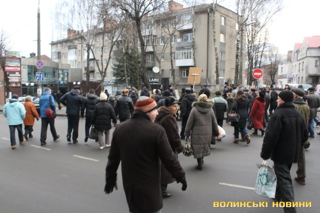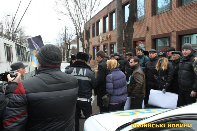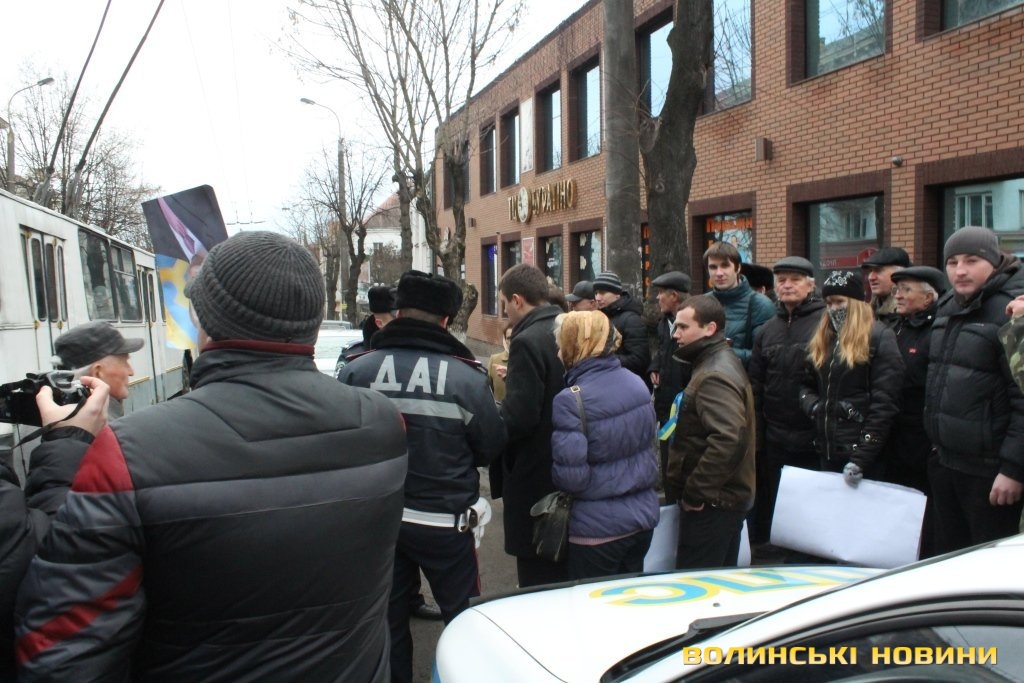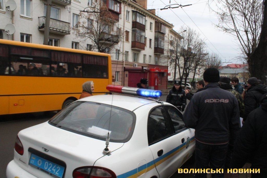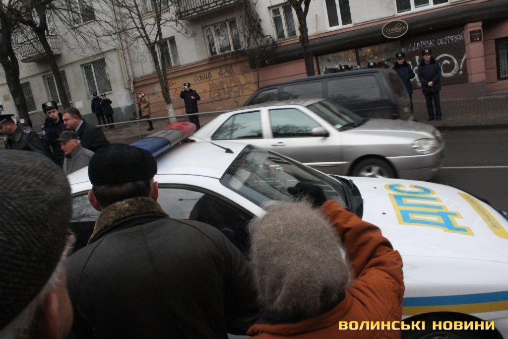 Мітингувальників, які пікетували прокуратуру на знак протесту проти політичних репресій на Волині, сигналами підтримували водії авто, які їхали повз будівлю. На протилежному боці вулиці чергували працівники ДАІ. Одна з учасниць акції помітила та повідомила іншим, що одну з автівок, водій якої продемонстрував підтримку учасників пікету, даішники з невідомої причини зупинили. Невдовзі практично усі пікетувальники перейшли на протилежний бік вулиці та оточили авто працівників ДАІ.