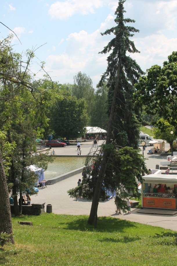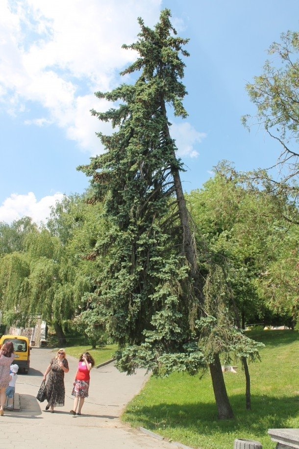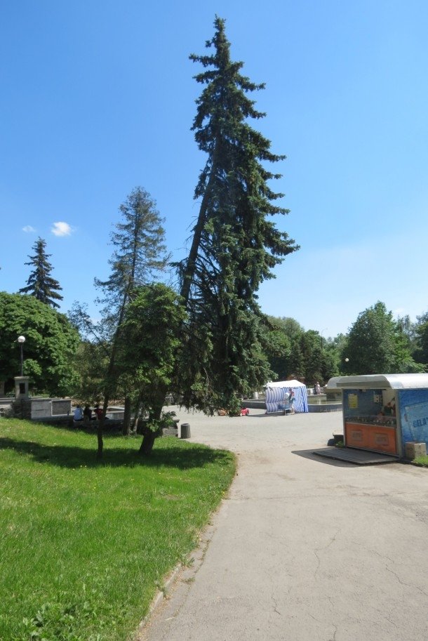 Так, висока ялина росте при вході до парку, над контейнером із морозивом. Дерево може впасти на голови людям при сильному пориві вітру у будь-який момент.