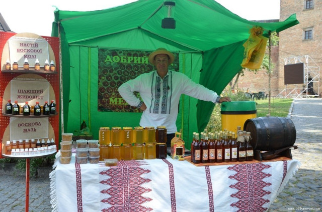 Окрім того, до замку привезли кіровоградського меду. Андрій Пилипенко, уродженець цього центрально-українського міста, каже, що тут мед розкуповують краще, аніж на його батьківщині. Пояснює це тим, що там поля більш засіяні, від чого і пропозиція медового продукту більша. Тут же, мовляв, луги… І ґрунти гірші. Цього сезону, розповідає Андрій, з 260 сімей зібрав вже 4 тонн меду.