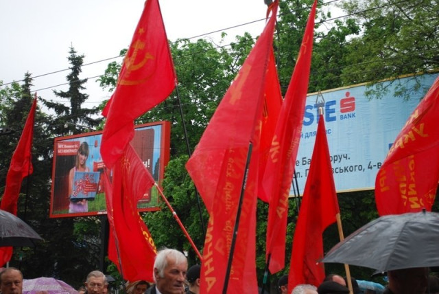 Парад очолювали військові та ветерани, які несли в руках стяги колишнього Радянського Союзу.