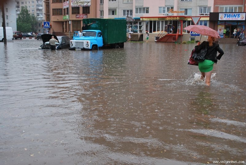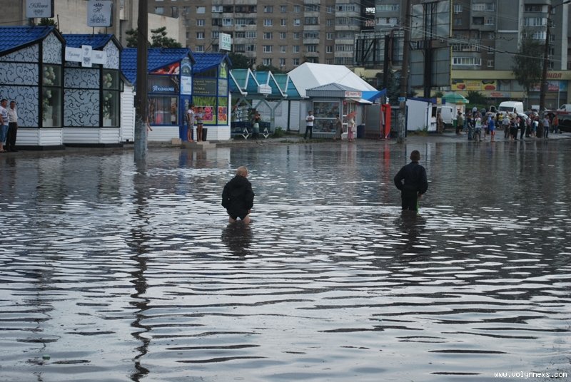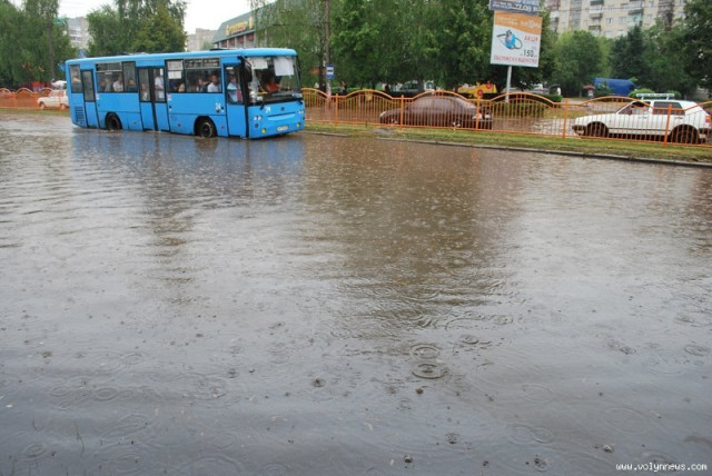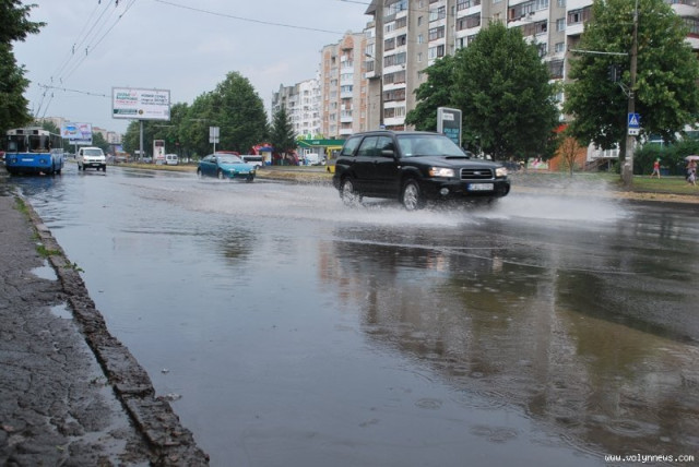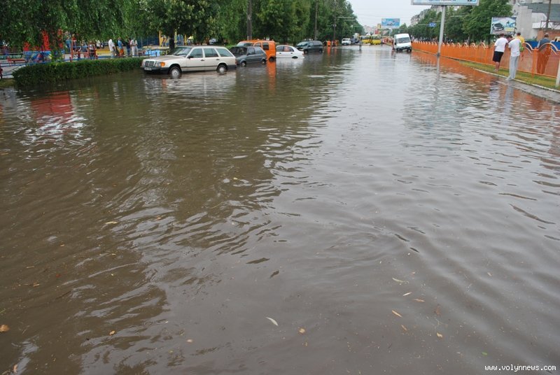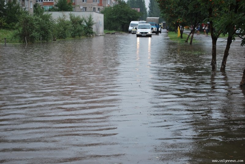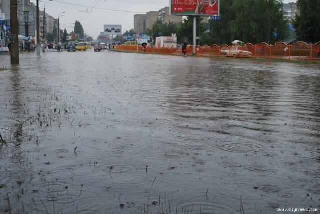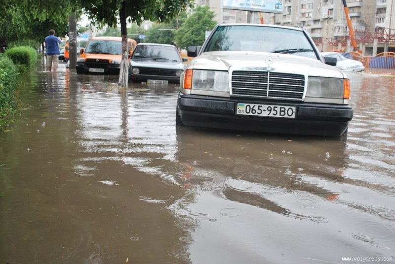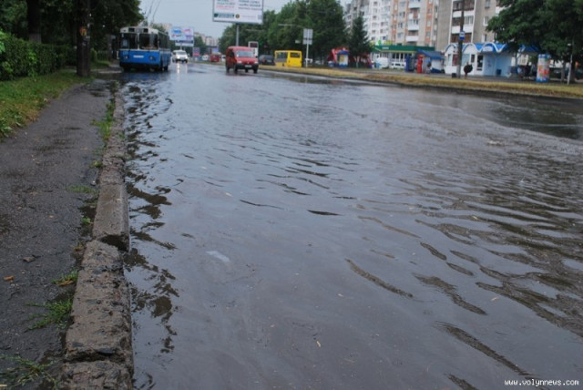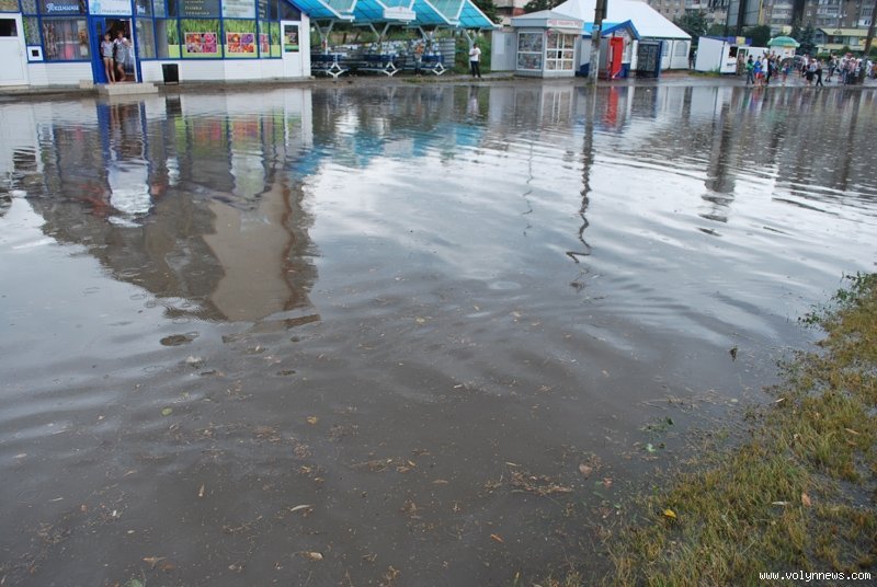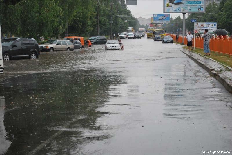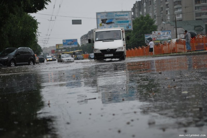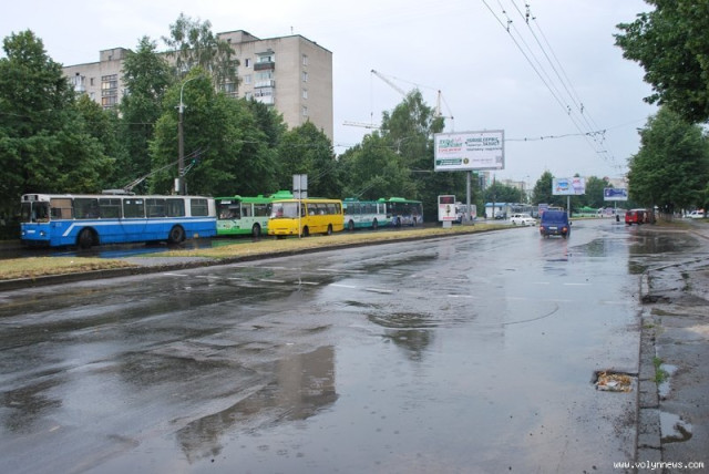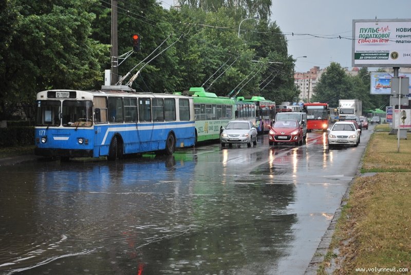 Через дощ, який випав по обіді 12 липня в Луцьку, величезні калюжі утворилися на кількох вулицях обласного центру. Декілька авто стали заручниками погодних умов, а рух тролейбусів проспектом Соборності не відновлено й до нині. Кільканадцять «рогатих» чекають, поки зникне калюжа поблизу «Гостинця».