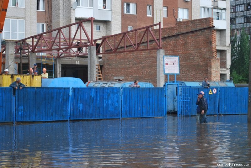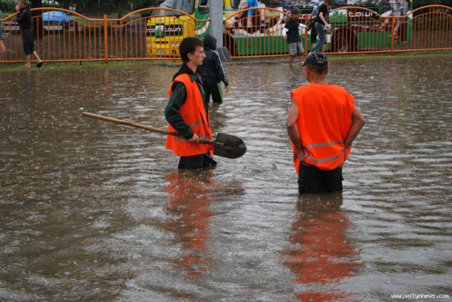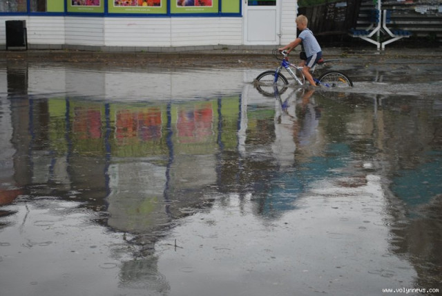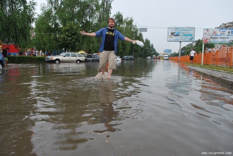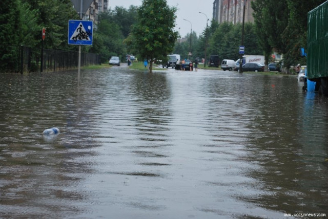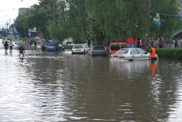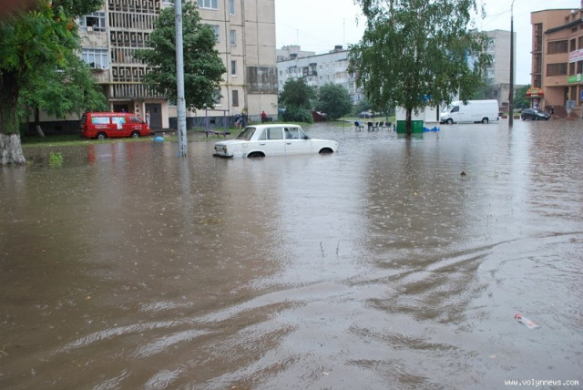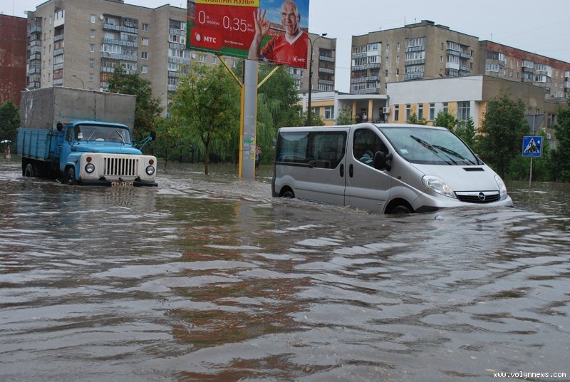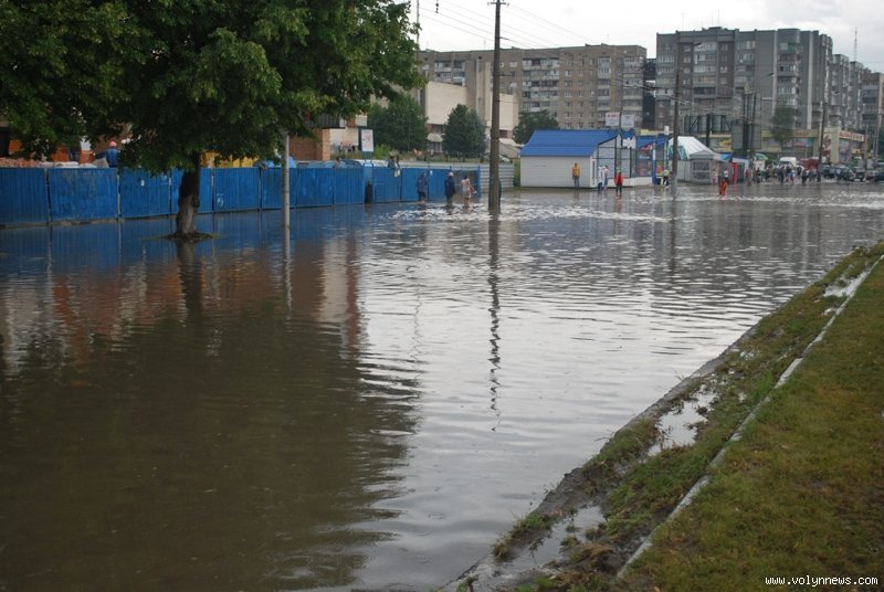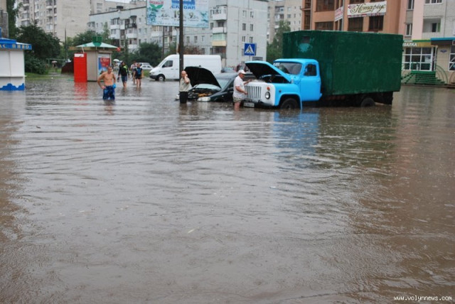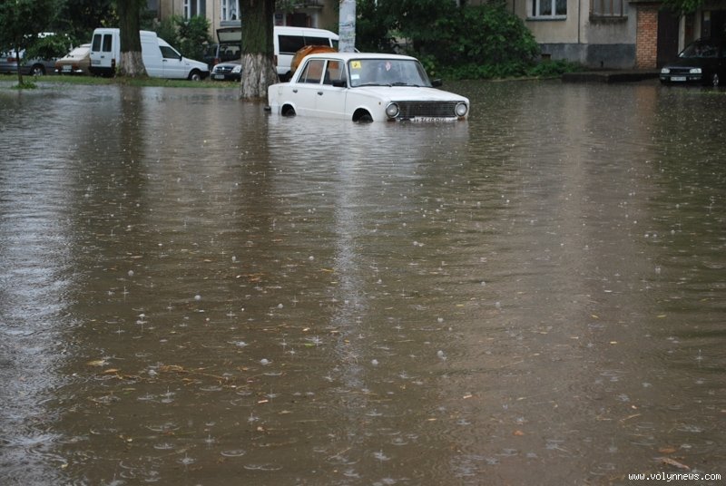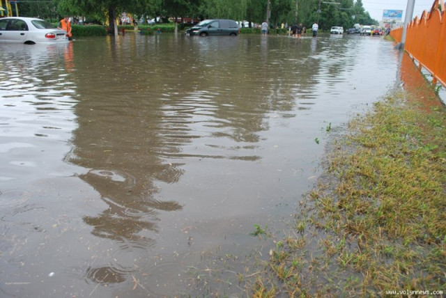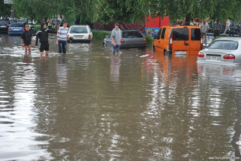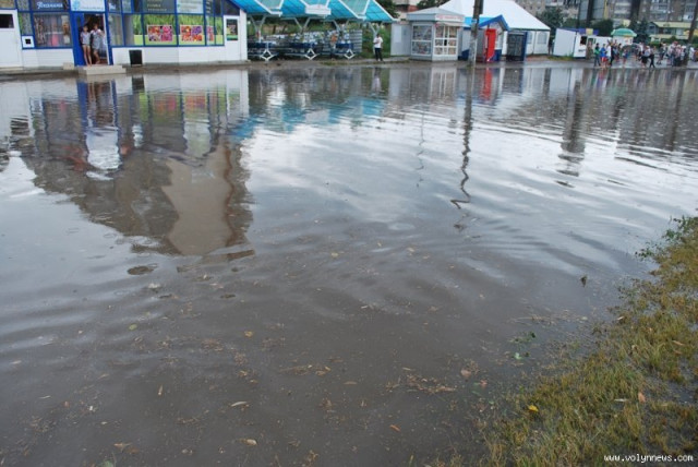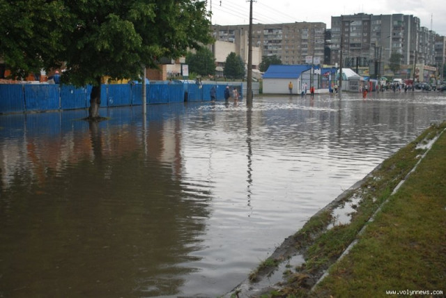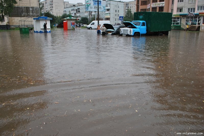 Через дощ, який випав по обіді 12 липня в Луцьку, величезні калюжі утворилися на кількох вулицях обласного центру. Декілька авто стали заручниками погодних умов, а рух тролейбусів проспектом Соборності не відновлено й до нині. Кільканадцять «рогатих» чекають, поки зникне калюжа поблизу «Гостинця».