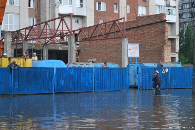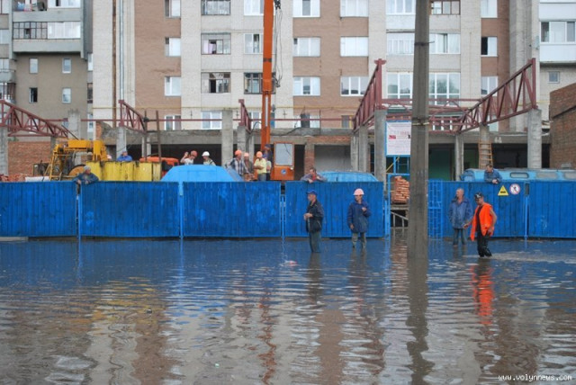 До слова, підтопило й будівництво багатоповерхівки на проспекті Соборності. Місцеві люди розчищали змиви, аби вода швидше зійшла в каналізацію.