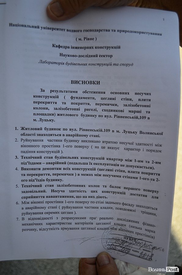 Обстежували будинок і надали свої висновки експерти з Лабораторії будівельних конструкцій та споруд Національного університету водного господарства та природокористування.