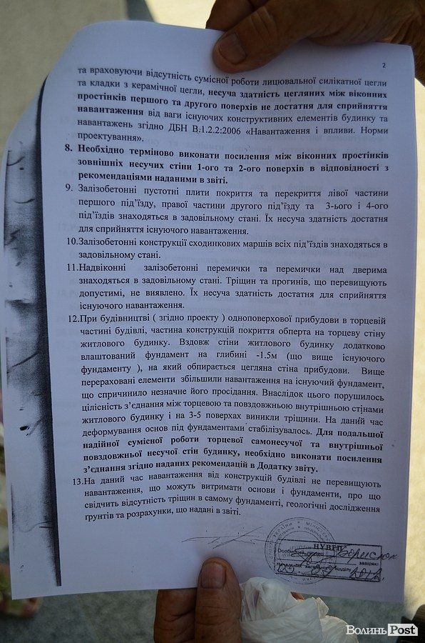 У висновку йдеться, що будинок знаходиться в аварійному стані. Не дозволяється подальша експлуатація квартир між 1 та 2 підʼїздами.