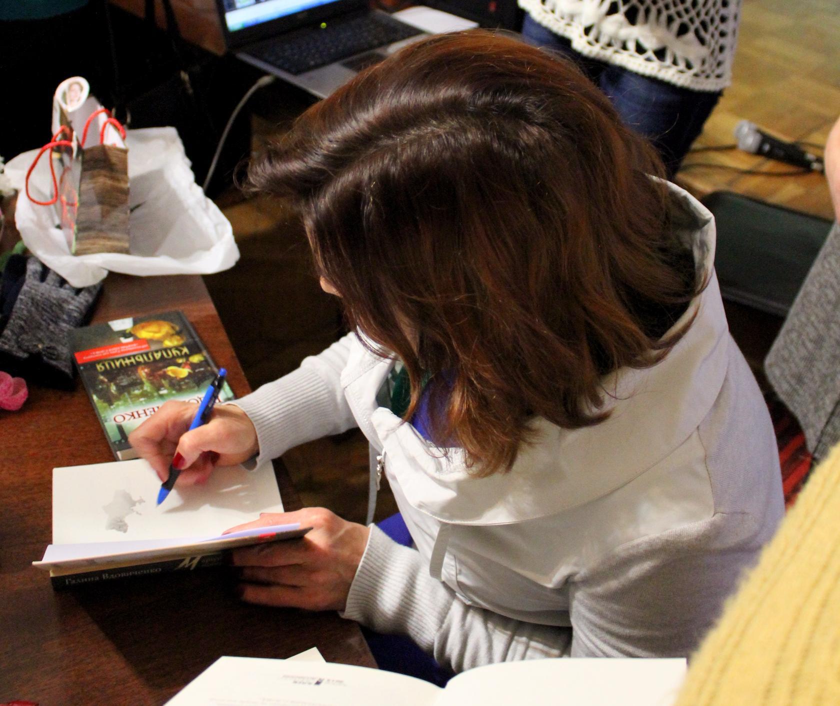 Зустріч із Галиною Вдовиченко завершилася ажіотажем навколо її книг та чергою за автографами. І не дивно, бо кожен читач мав за честь особисто подякувати письменниці за роман про людину, про її метання й пошуки, і про любов, яка одвіку проростала всупереч усім війнам і терористам.