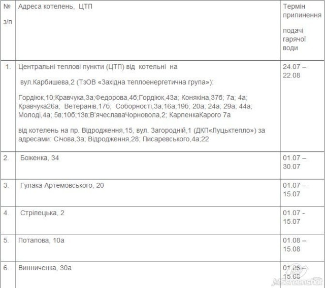 Подача гарячої води від котелень, центральних теплових пунктів ДКП «Луцьктепло» та ТзОВ «Західна теплоенергетична група» частково припиниться у зв’язку з профілактичним ремонтом тепломереж у 2013 році.