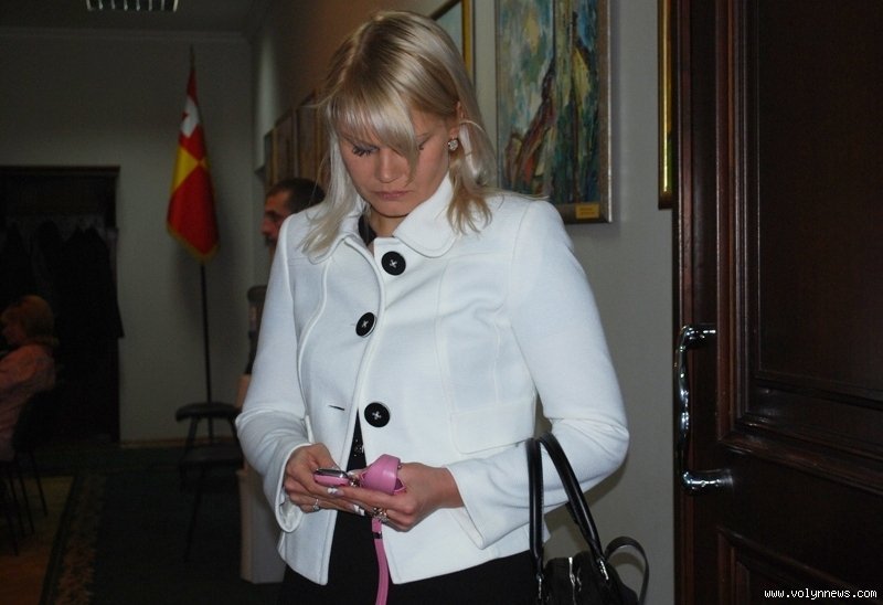 Тим часом свою пунктуальність демонструвала очільниця Європейської партії на Волині Олена Голєва, яка теж прибігла у раду завчасно. Була, як завше, «при параді» – в ошатному вбранні, охайна, усміхнена, з гламурним рожевим мобільником, проте дещо схвильована. Гучний звук у телефоні відключила одразу, аби не створювати шуму.
