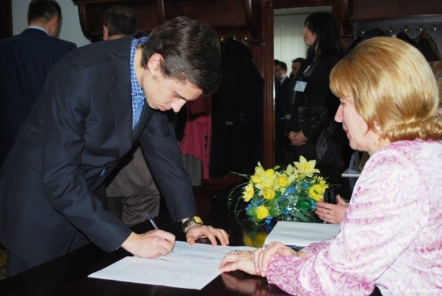 Наймолодшого депутата у залі вже чекав однопартієць – учасник мерських перегонів Євген Мельник.