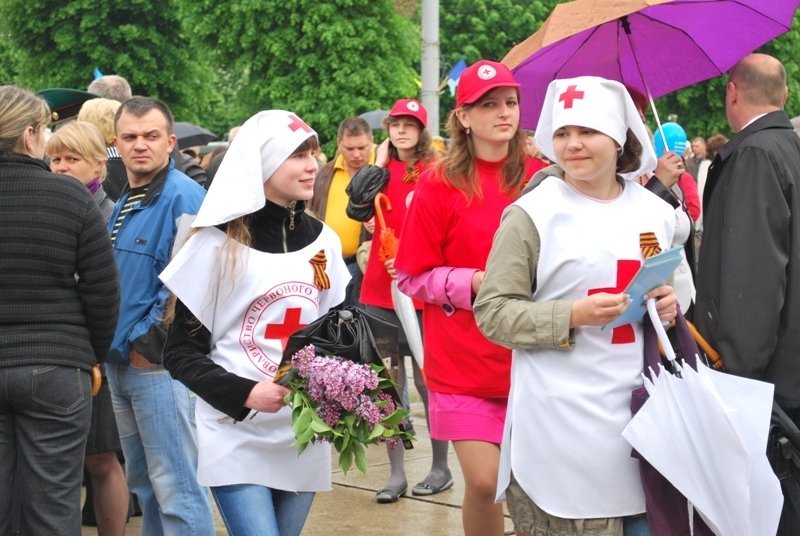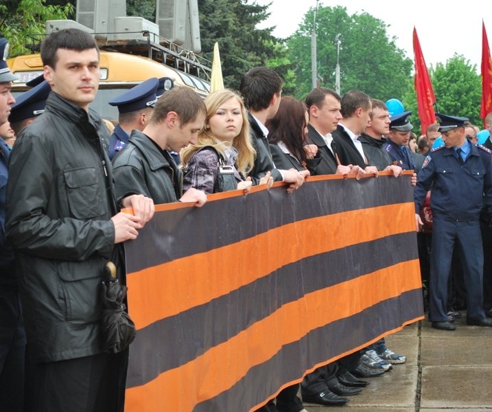 Більшість присутніх почепили на одяг георгіївську стрічку, а кілька молодиків принесли платки, розмальовані в чорно-помаранчеві тони.