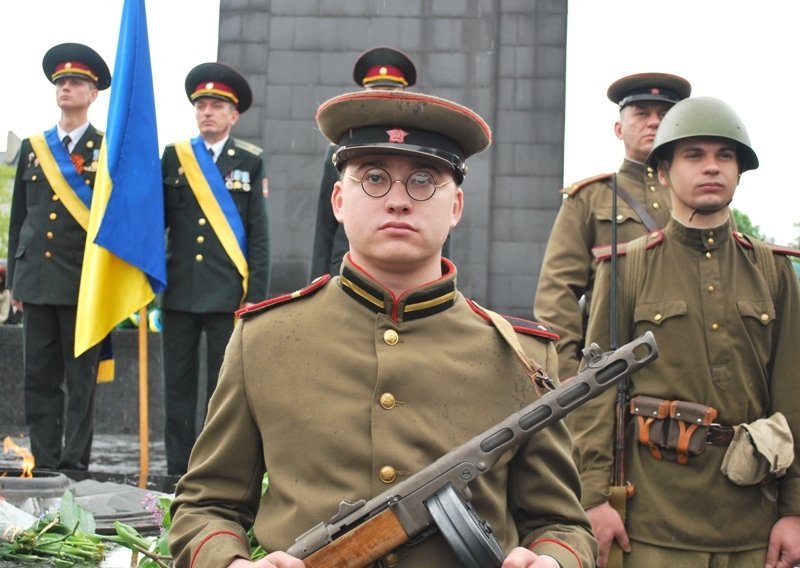 Охочі роздивлялися двигун джипу-ГАЗу 1943 року, який віз кількох ветеранів під час святкового параду. А біля пам’ятної стели стояли молоді солдати у військовій формі часів Другої світової війни.