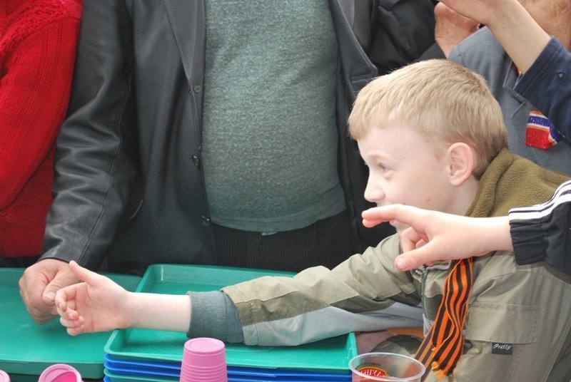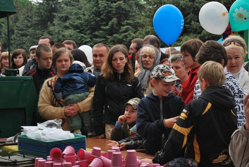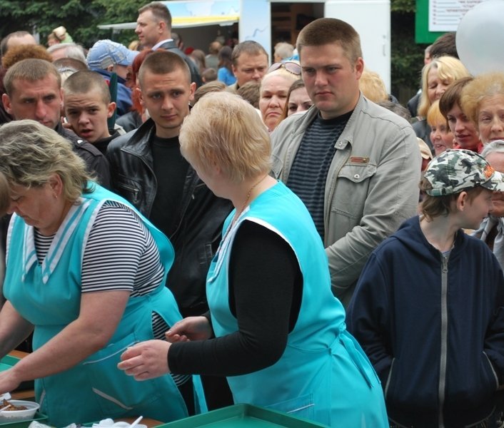 Частувати наїдками солдатської кухні з нагоди святкування 65-ї річниці Дня Перемоги повинні були близько опівдня. Проте, через те, що керівництво області затрималося на молебні на Меморіалі пам’яті, пригощання запізнилося на годину.