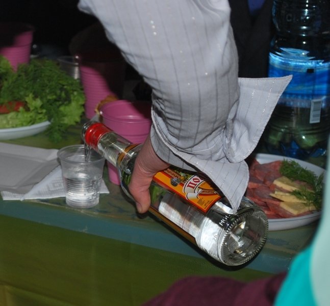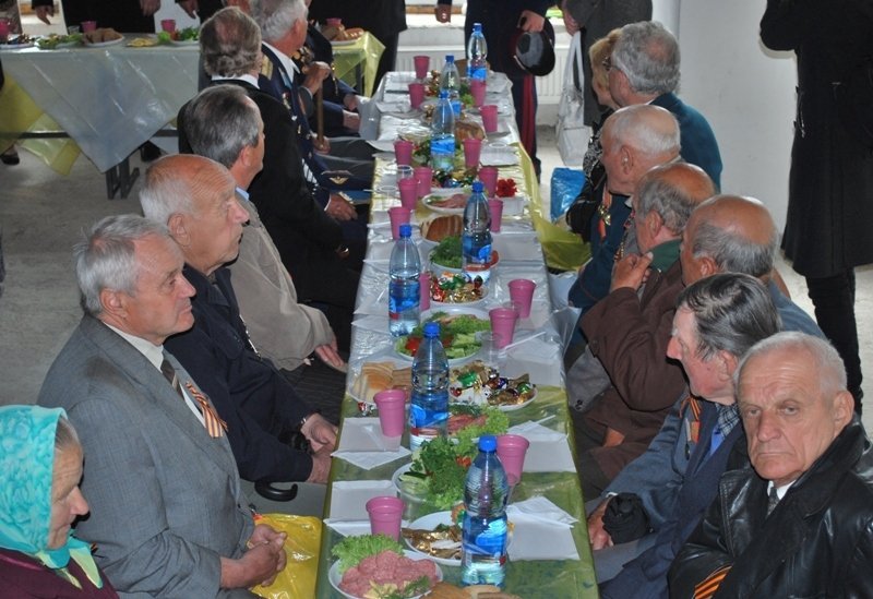 Ветерани відкладають у бік кепки та квіти, їм накривають стіл та наливають бойових сто грамів горілки.