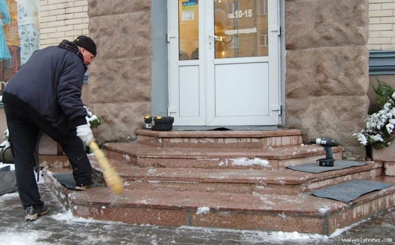 Поблизу магазинів та кафе вовтузяться працівники – власноруч чистять територію від снігу. Деякі навіть убезпечують слизькі східці – прикріплюють покриття, на якому відвідувачі не будуть ковзатись.