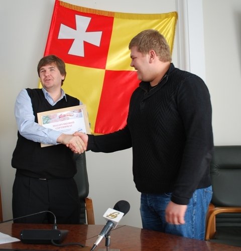 Директор департаменту молодіжної політики і спорту Луцької міської ради Володимир Пащенко отримав сертифікат на 250 кілограм з рук представника ТМ «М ’ясопром Торчин» Віталія Бровіна.