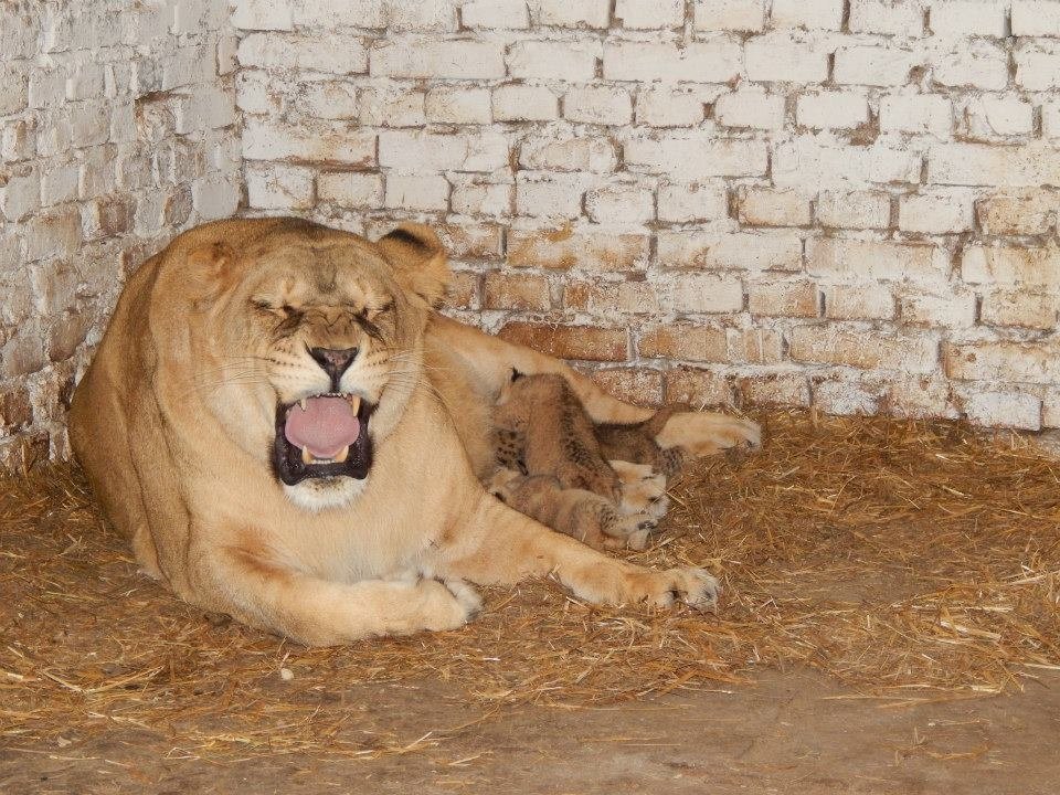 Сьогодні левиця Даша показала своїх малюків) Ми знали скільки їх, але тепер офіційно повідомляємо - левенят у нас троє))) Народжені 13-го липня, малята до сьогодні були лише у будиночку. І мама-левиця покидала своїх дитинчат на лічені хвилини. Тепер Дашуня визначила безпечну та комфортну територію для своїх малюків. На радість нашим відвідувачам)))»
