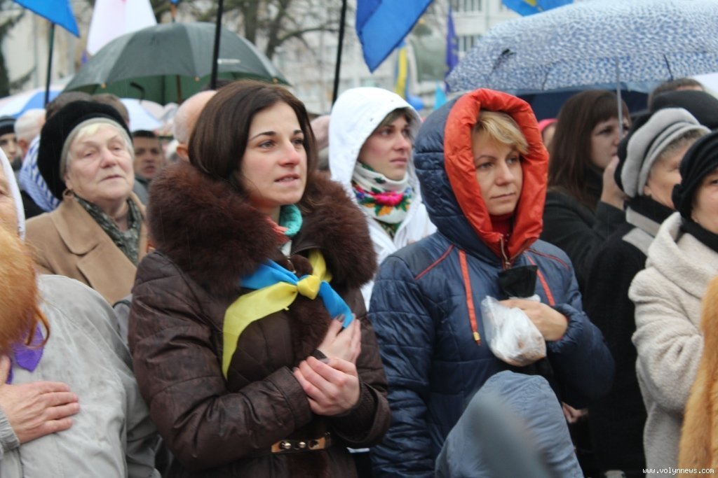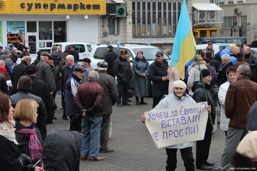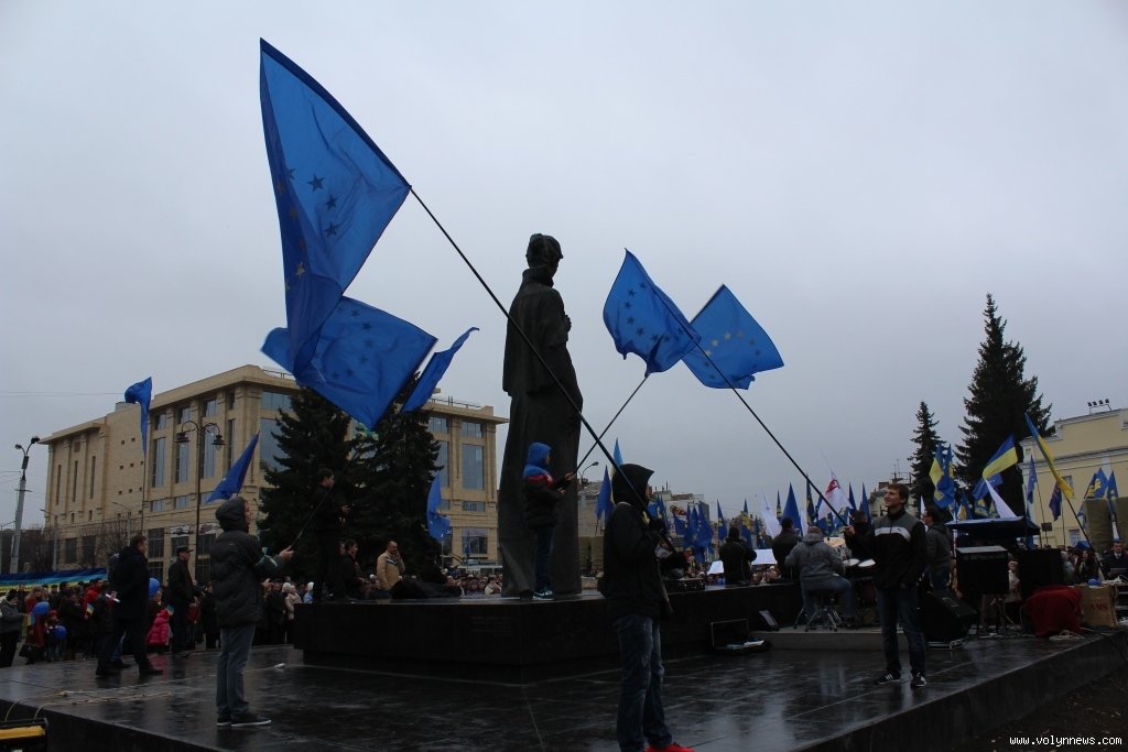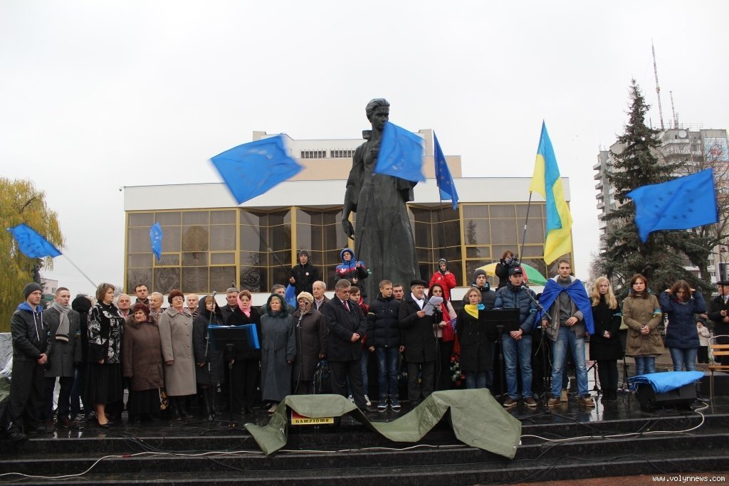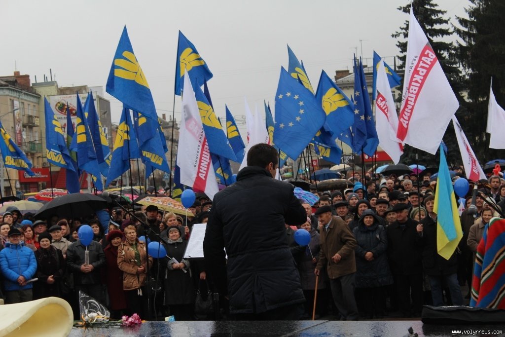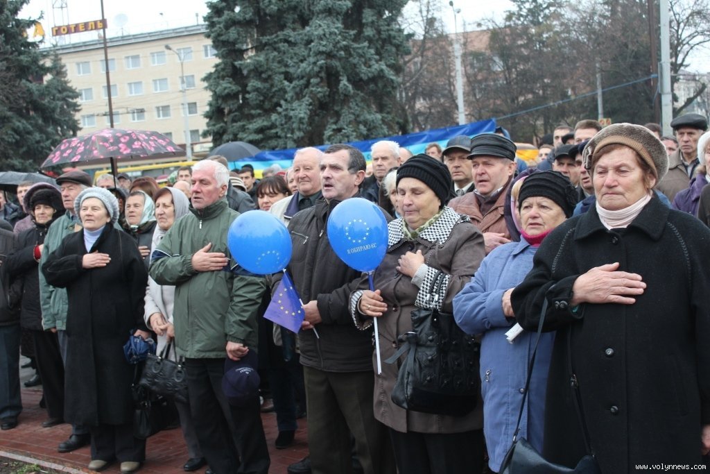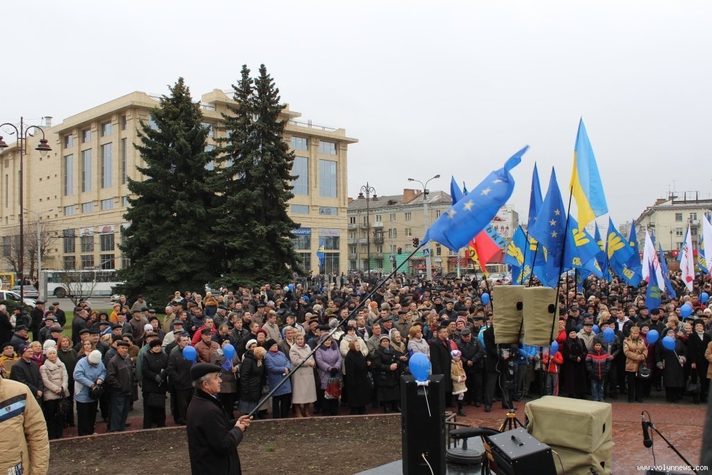 Мітинг відбувся 24 листопада. Тисячі лучан прийшли висловити протест проти згортання політики євроінтеграції. Багато хто з присутніх ставив підписи на підтримку європейського курсу України, які збирали у наметовому містечку. Так, після завершення мітингу назбиралося приблизно 4 тисячі підписів. Також роздавали символіку – повітряні кульки у кольорах прапора Європейського Союзу та прапорці України та ЄС.