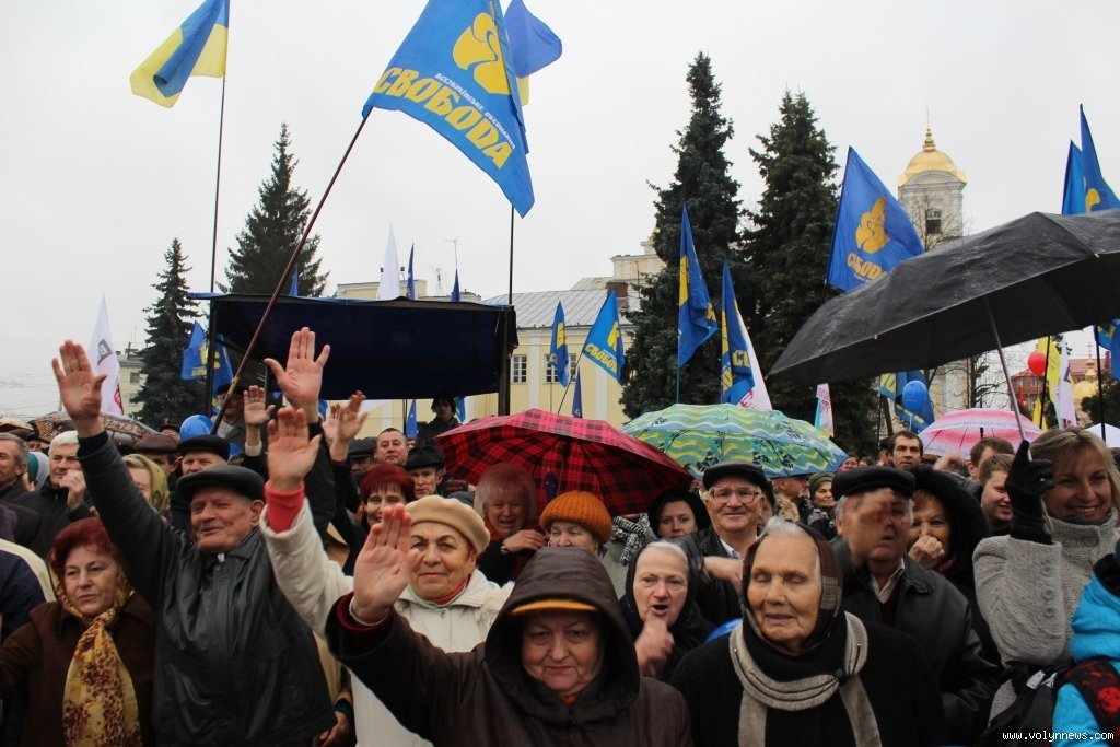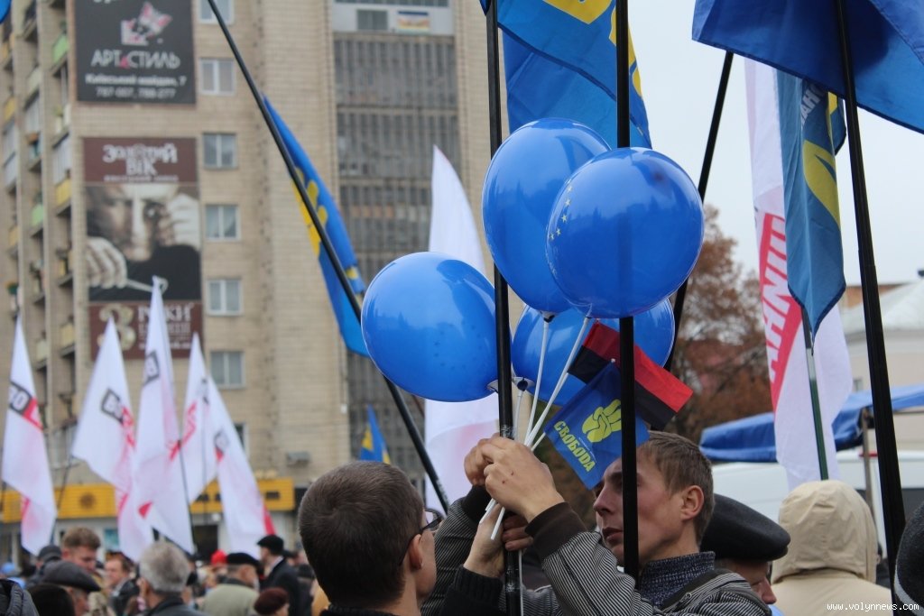 Серед присутніх на майдані прапорів переважала символіка опозиційних політичних партій, хоча було й чимало прапорів Євросоюзу та синьо-жовтих стягів. Зі слів промовців, у луцькому мітингу взяли участь приблизно п’ять тисяч осіб не лише з Луцька, а й з усіх районів Волині.