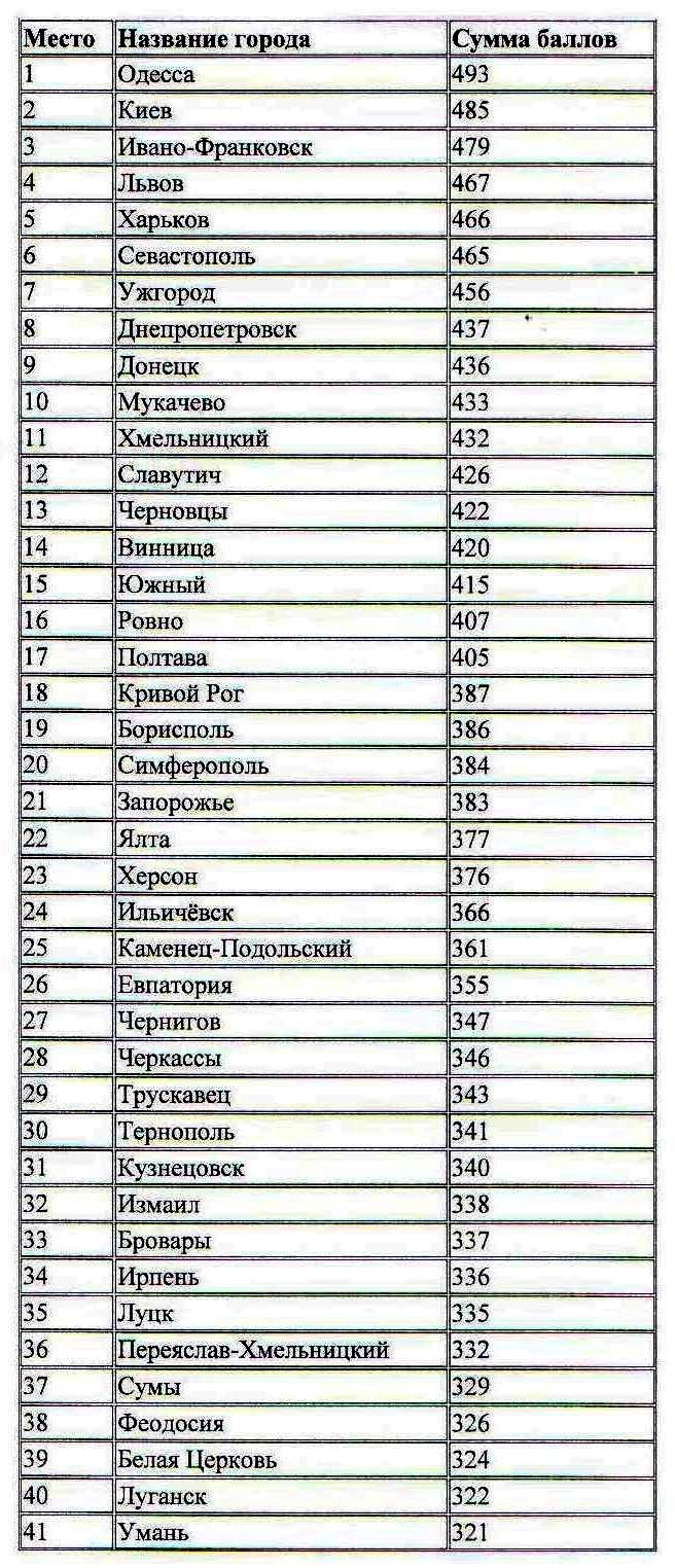 На першому місці рейтингу – Одеса. Київ посів друге місце, Івано-Франківськ – 3-тє, Львів – 4-те, Харків – 5-те.