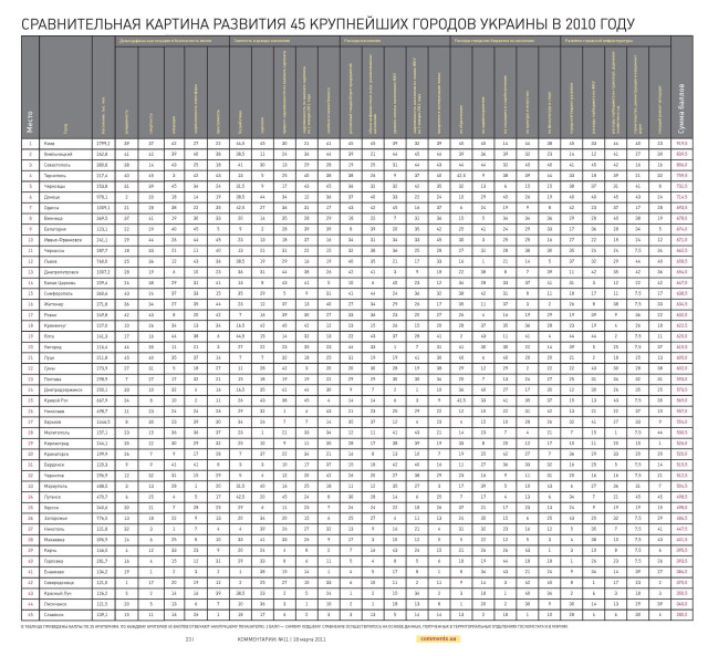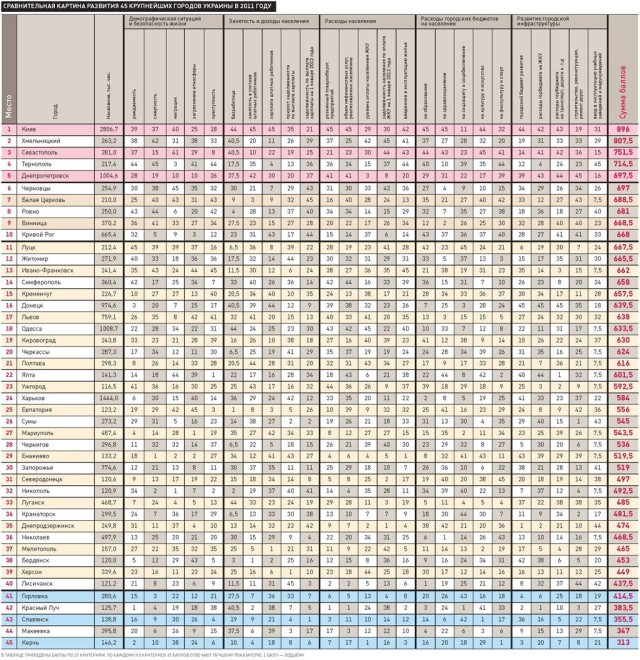 Видання порівняло 45 найбільших міст України за 25 критеріями, які характеризують демографічну ситуацію і безпеку життя, зайнятість, доходи і витрати населення, витрати міських бюджетів, розвиток міської інфраструктури протягом минулого року.