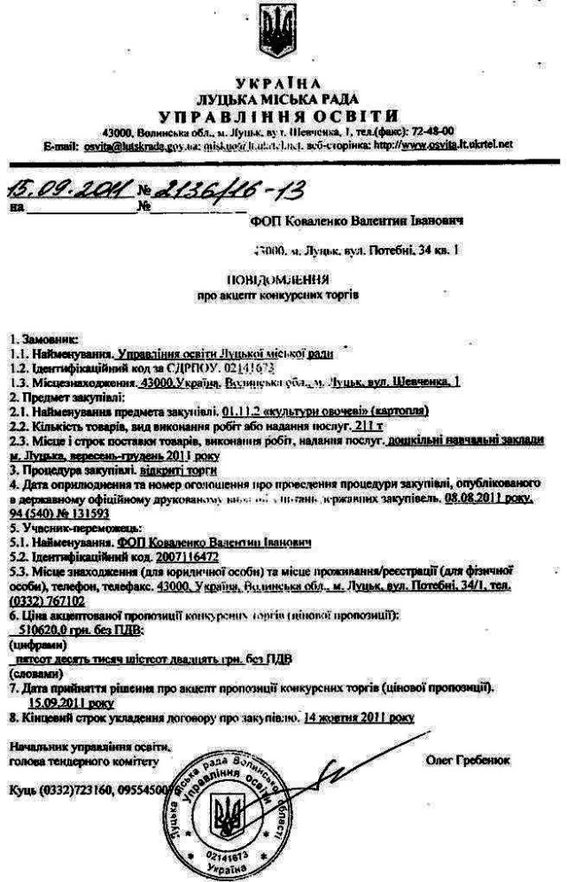 На сайті управління освіти Луцької міської ради опублікована копія Повідомлення про акцепт комунальних торгів – документ від 15 вересня 2011 року № 2136/16-13. В ньому йдеться про те, що для забезпечення дошкільних закладів міста картоплею проведено тендер. За його результатами закуплено 211 тонн бульби за ціною 2 гривні 42 копійки за кілограм у фізичної особи – підприємця Коваленка. Загальна вартість угоди – понад 510 тисяч гривень.