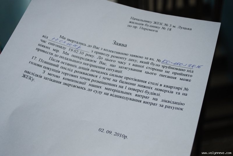 Навесні 2010 мешканці будинку писали колективні звернення до ЖПК №3, яке їх обслуговує, до департаменту ЖКГ Луцькради та на ім’я міського голови Богдана Шиби.