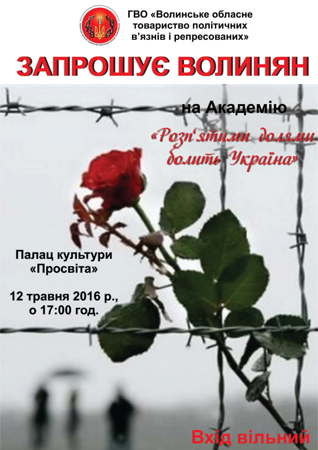 Організатори заходу запрошують усіх охочих 12 травня завітати у Палац культури міста Луцька (вхід вільний) на академію «Розп’ятими долями болить Україна».