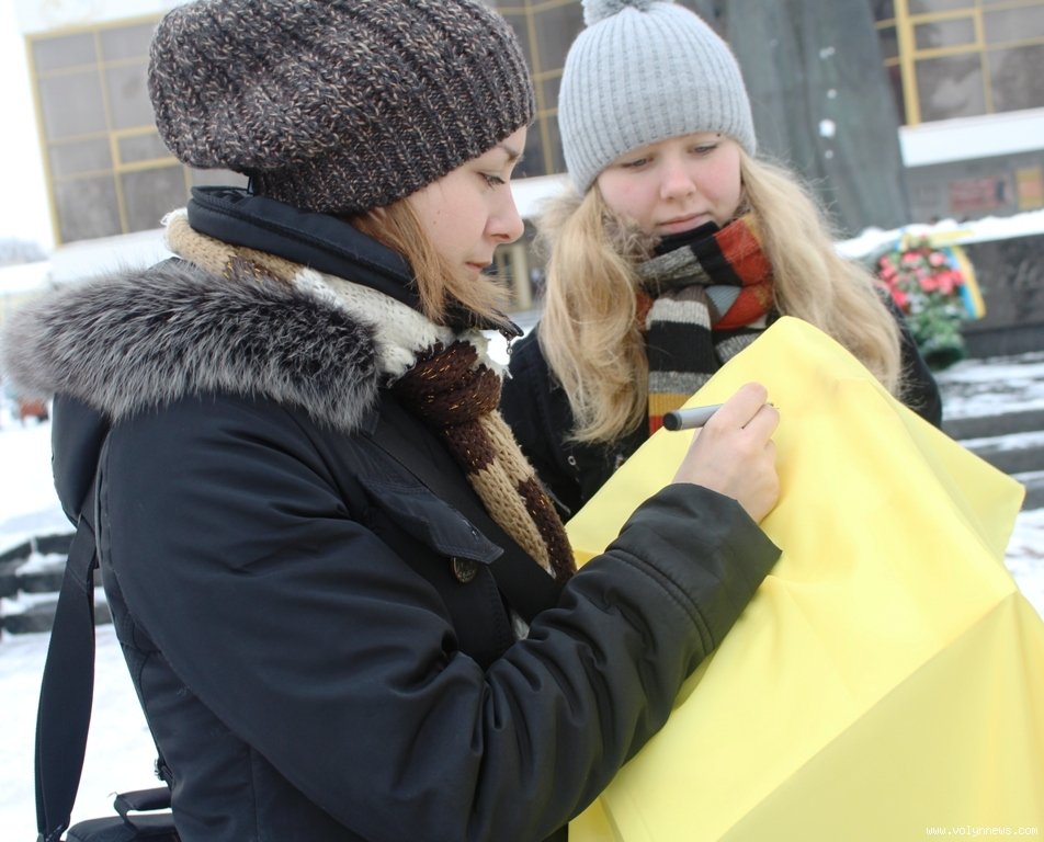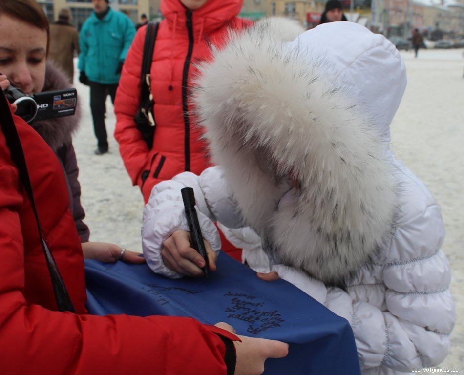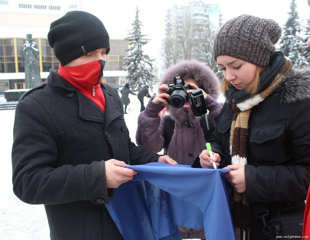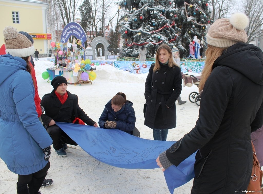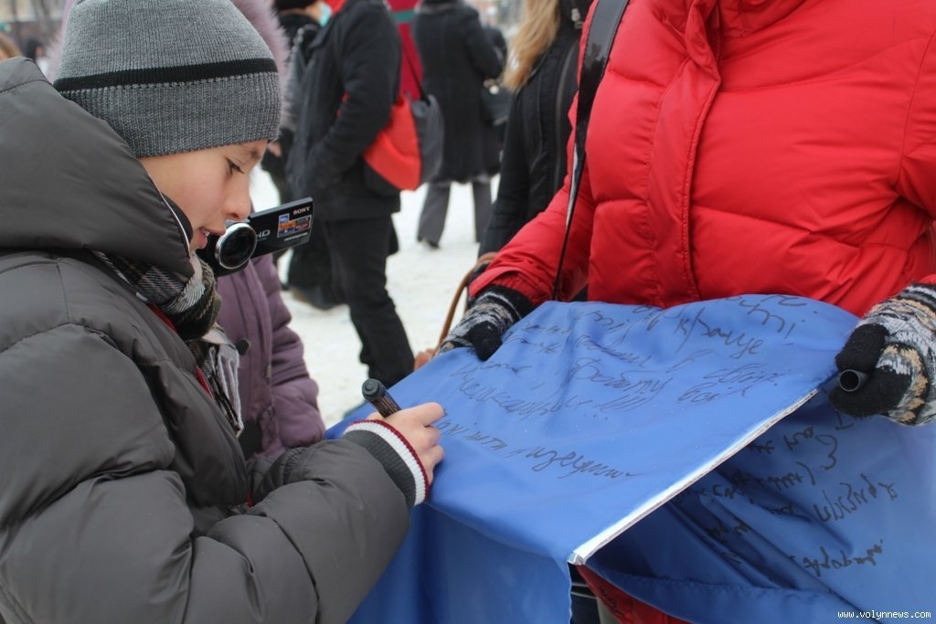 Про це вони висловивлися під час акції «Схід і Захід разом» до Дня Соборності України, що відбулась на Театральному майдані в Луцьку, 20 січня. Організатори збирали побажання лучан на синє і жовте полотна, які після закінченню акції зшили в прапор та ввечері обіцяють відправити до Києва.