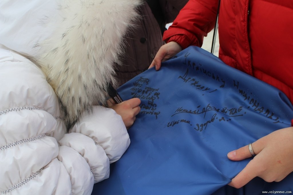 Як розповіли організатори, традиційно 22-ого січня у Києві на мосту Патона буде проводитись щорічна молодіжна акція «Живий ланцюг єдності». На жаль, не всі охочі молоді люди мають змогу поїхати у столицю. Тож луцькі нацальянсівці вирішили долучитися до акції, яку традиційно проводять одеські патріоти - захід, під час якого учасники міста пишуть на жовтому та синьому полотнах побажання Україні, зшивають з них прапор і передають його у Київ на «Живий ланцюг».