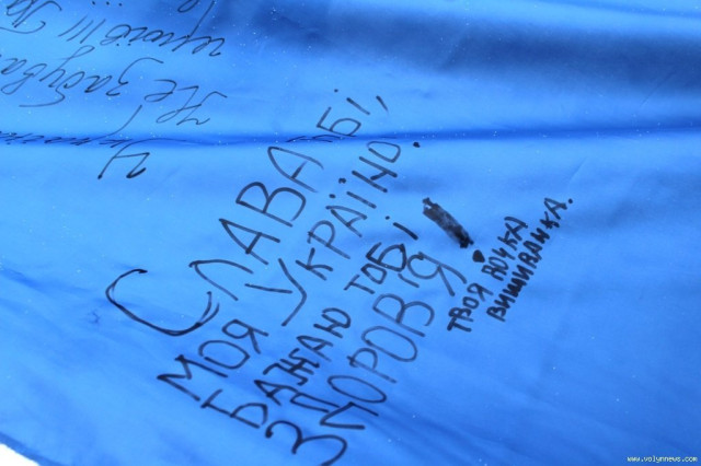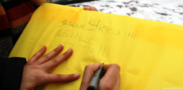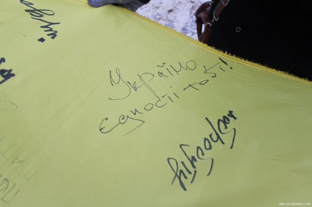 «Західняки» і «східняки» писали на жовтому та синьому полотнах побажання Україні, вони братались, співали гімн України й українські пісні.