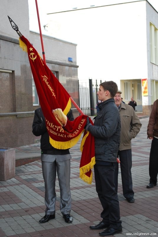 Учасники несли в руках червоні прапори Комуністичної партії України та стяг Волинського обласного комітету ЛКСМ України.