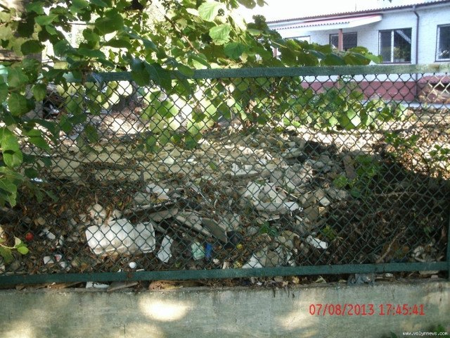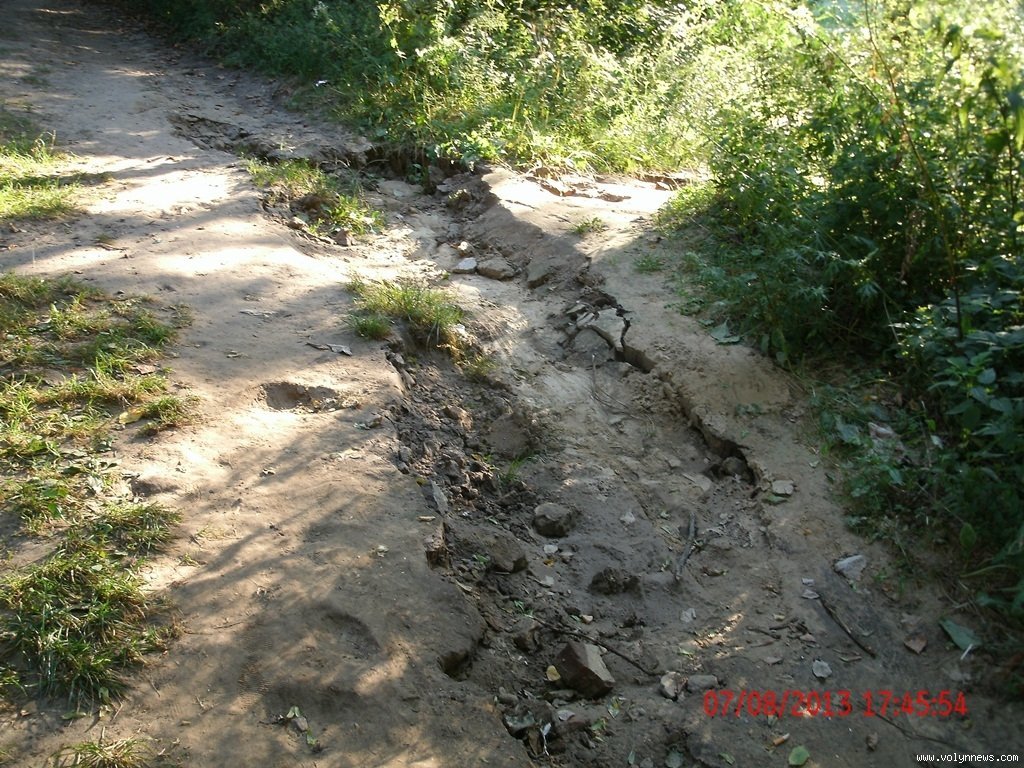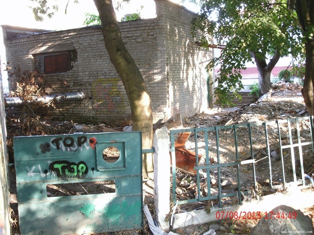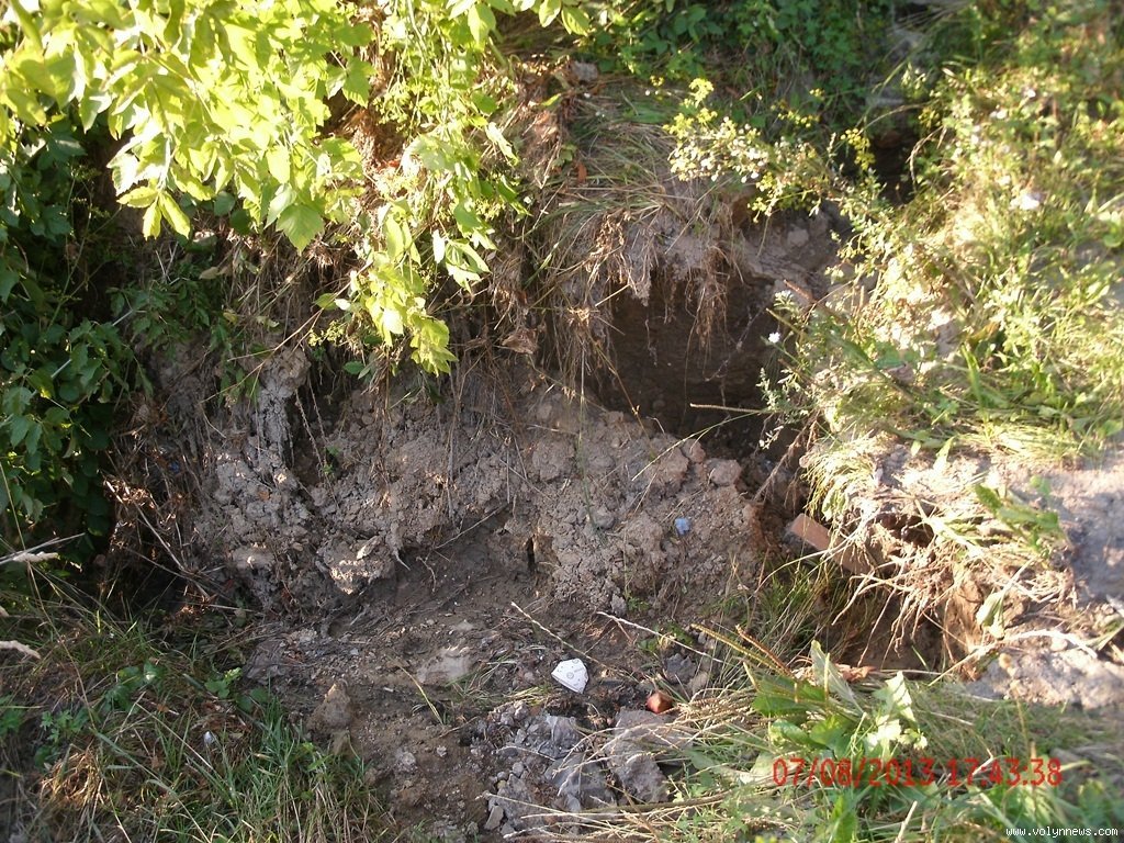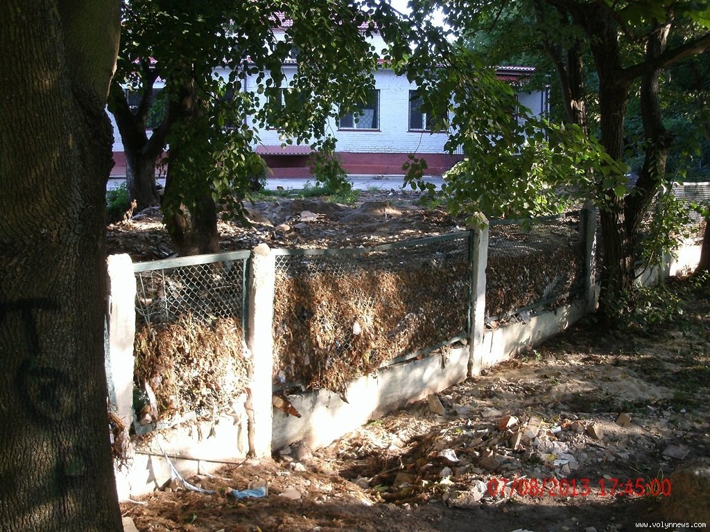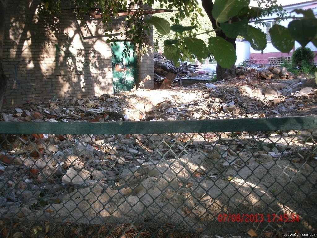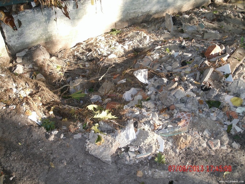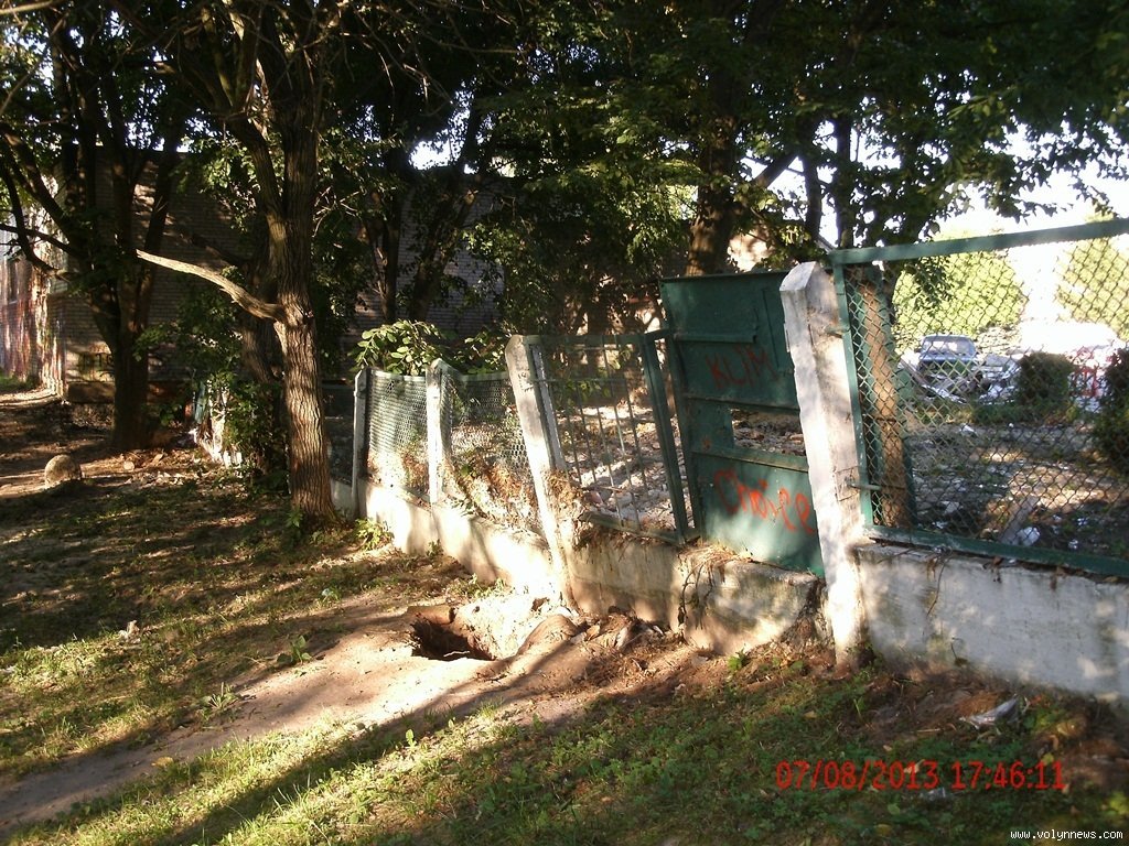 На фото кореспондента Волинських Новин можете побачити купу сміття, зокрема будівельного, яка збиралася на задньому дворі лікувального закладу упродовж близько двох років. Оскільки сміття не вивозилося вчасно, то наплив води під час зливи ледь не зніс паркан разом з відходами. Частина будівельного непотребу разом із водою спускалося вниз по вулиці – до річки Сапалаївка. Сильний потік вимив великий яр, що заввишки сягає інколи навіть зросту людини.