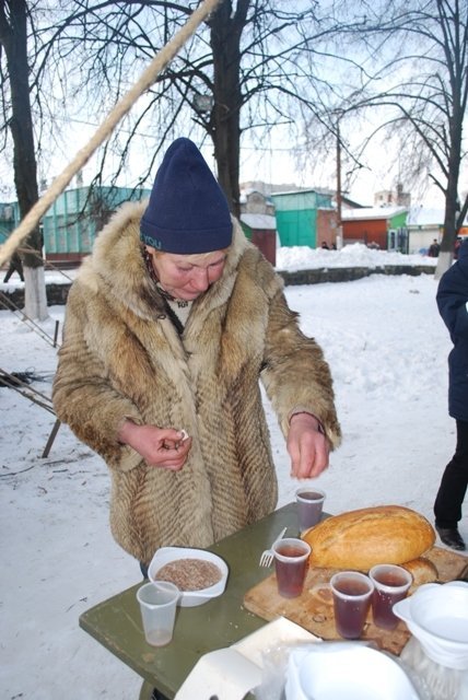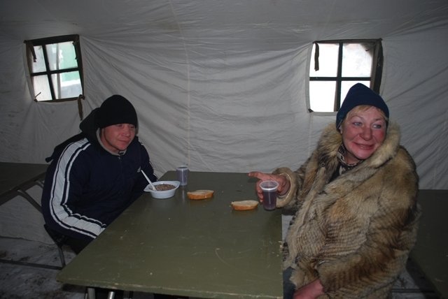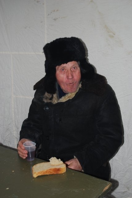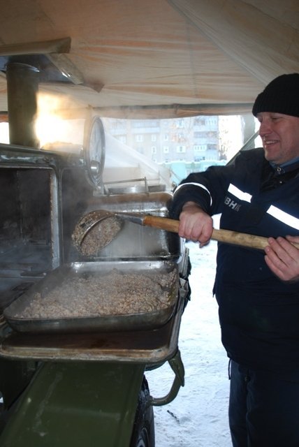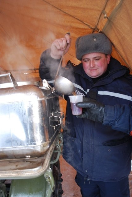 Працівники МНС радо частують людей гречаною кашею з маслом та солодким чаєм. На «десерт» – хліб. Посуд – одноразовий пластиковий. Використаний відразу викидають до пакетів, котрі «прикрашають» входи до палатки зі столиками та «буржуйкою». Деякі безхатченки уже встигли побувати у пункті обігріву двічі і збираються прийти сюди вечеряти.