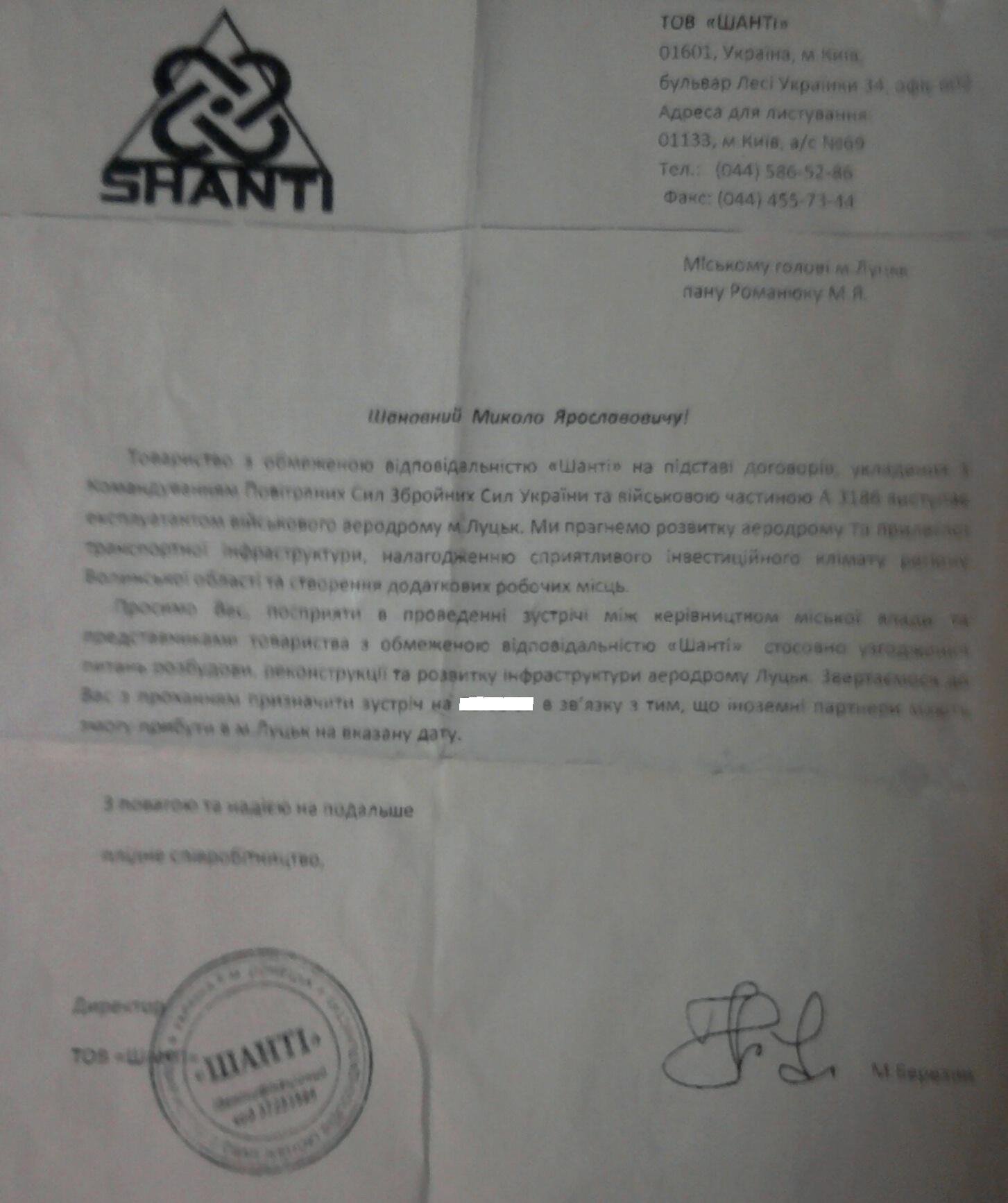 У розпорядження «ВН» потрапив лист за підписом директора ТзОВ «Шанті» М.Березина до луцького мера Миколи Романюка. Як випливає із документу, саме це підприємство займатиметься розбудовою міського аеропорту.