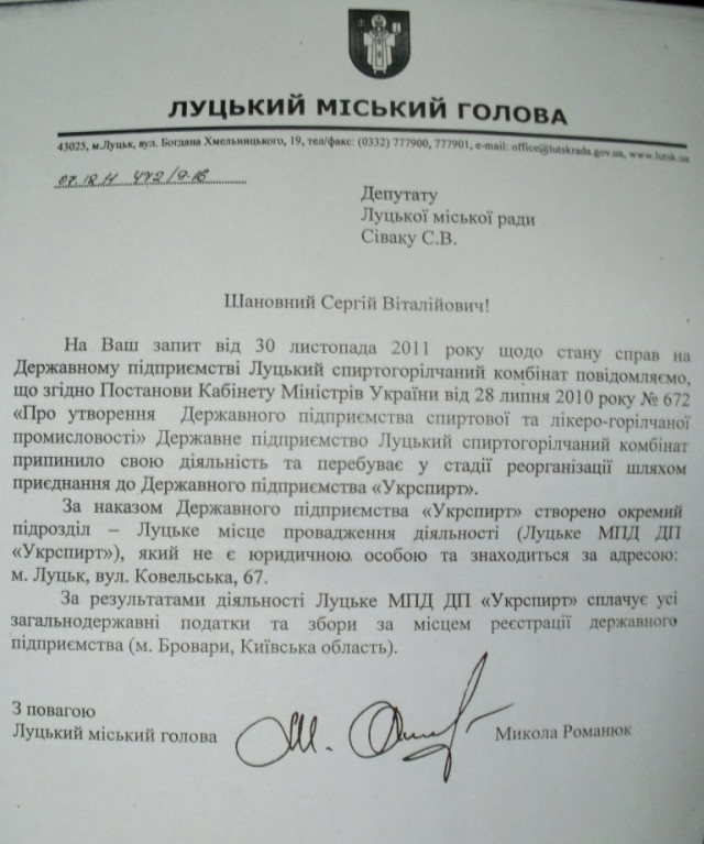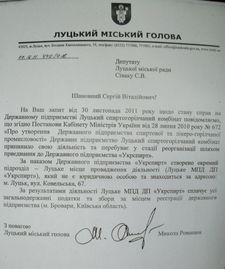 У відповіді на запит Луцький міський голова Микола Романюк повідомив депутата, що підприємство припинило свою діяльність і перебуває у стадії реорганізації шляхом приєднання до Державного підприємства «Укрспирт».