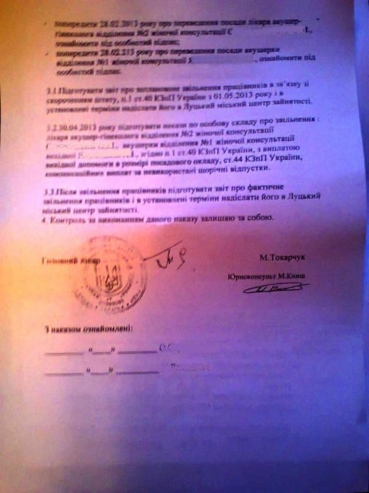 Так, одному з лікарів акушерів-гінекологів відділення жіночої консультації КЗ «Луцький клінічний пологовий будинок» видали попередження про звільнення з пропозицією переведення на цю ж посаду в КЗ «Луцька міська поліклініка №1», зокрема в новоутворене відділення «Амбулаторія загальної практики – сімейної медицини» на вулиці Привокзальна, 13 у Луцьку.