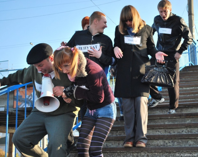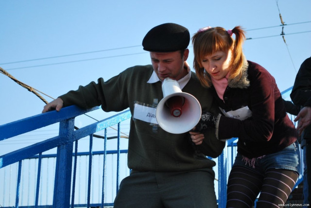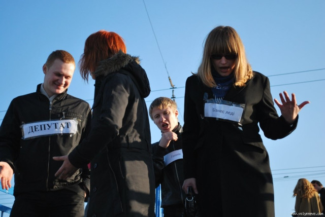 Свій протест молодь висловила неординарно. Кожен учасник театралізованого дійства грав свою роль - «дідуся», «внучки», «бізнес-леді», «гопніка», «депутата» і навіть «вагітної жінки». Персонажі спустилися східцями вниз.