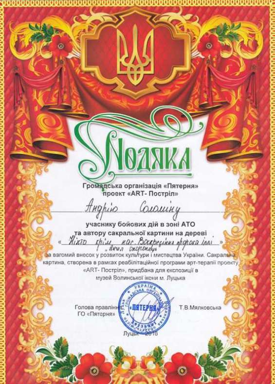 Арт терапія – це, насамперед, зміна стану свідомості, розкриття позитивного спектру емоцій та запасних внутрішніх ресурсів, зняття блоків і вивільнення почуття підвищеної тривожності.Музей Волинської ікони закупив 12 сакральних картин 11 авторів. Серед робіт є ікони, інкрустовані кулями та гільзами.