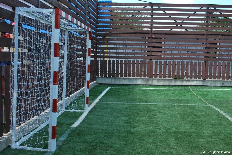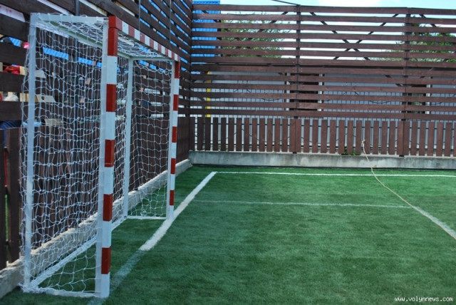 Майданчик має два сектори: перший - для ігор дітей віком до 9 років, другий - з футбольним, флорбольним та волейбольним полем для старших дітей.