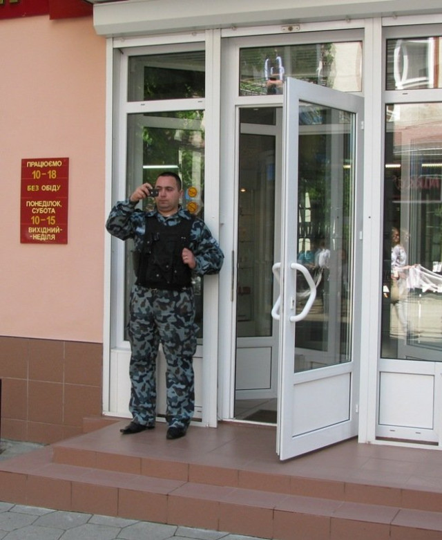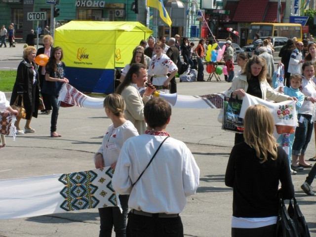 Подивитися на людей у вишиванках з рушниками в руках повиходили працівники магазинів, які розташовані на вулиці Лесі Українки.