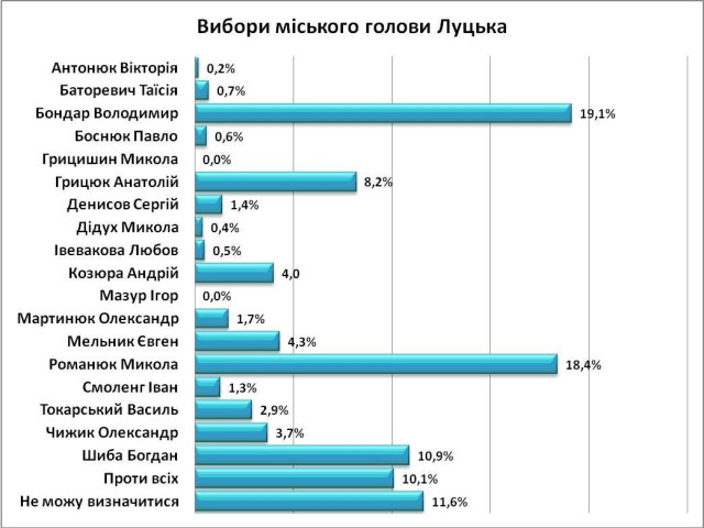 Інші 10 кандидатів набирають менш ніж по два відсотки. Не визначених лучан залишилось вже досить мало, всього 11,8%. Майже стільки мають бажання проголосувати проти всіх - 10,1%.