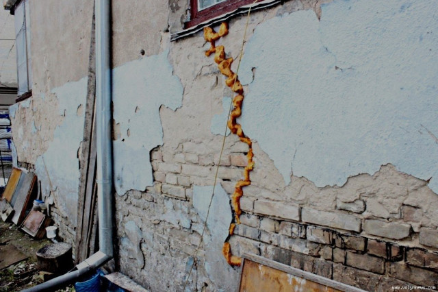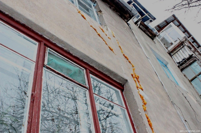 Мешканець під’їзду 68-річний пенсіонер Микола демонструє кореспонденту «ВН» тріщини на будинку: «Боїмося, що нас спіткає така ж доля, як жителів будинку, що завалився, на вулиці Рівненській. Регулярно замазуємо тріщини рідким пінопластом, але постійно виникають нові. Стіни тріщать по швах».