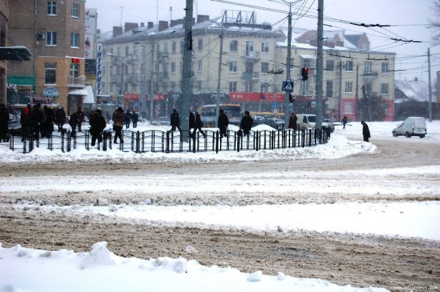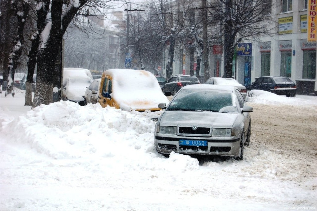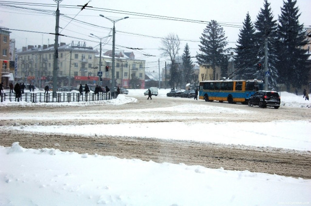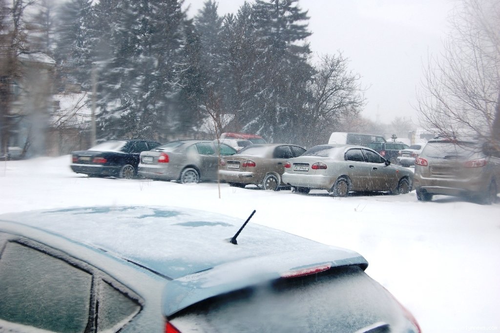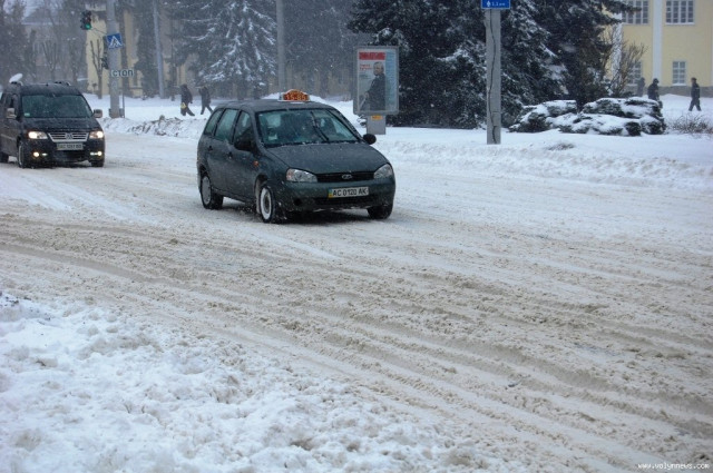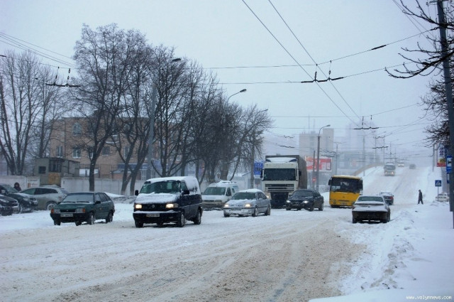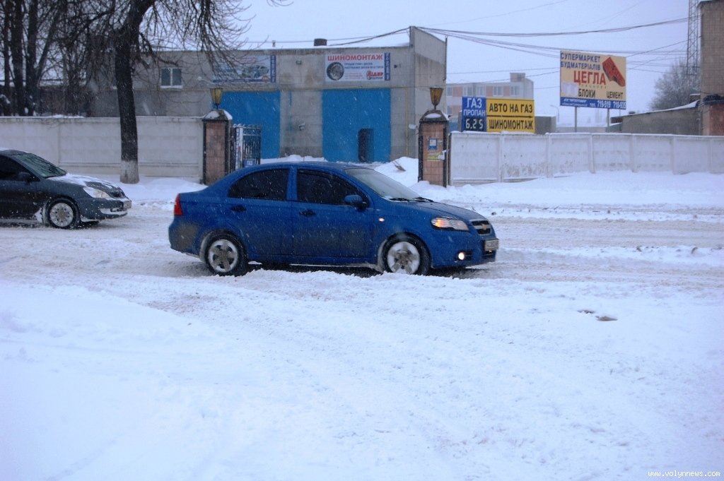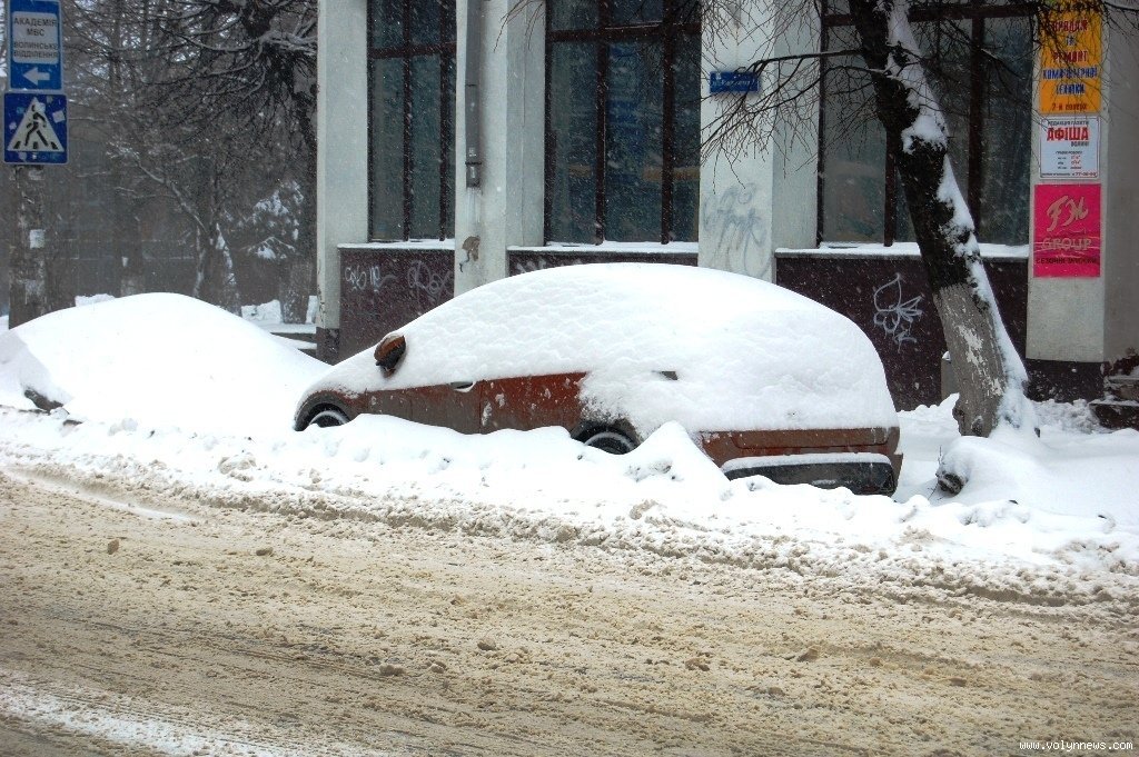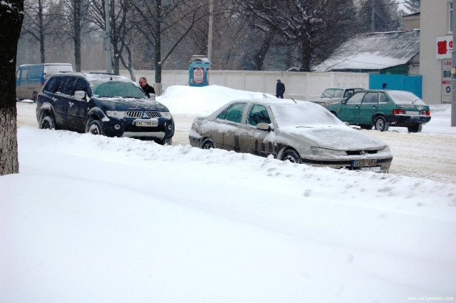 Так, основні дорожні артерії Луцька засипає снігом. Припарковані на узбіччях вулиць автомобілі «застрягають» під кількасантиметровим сніговим покривом.
