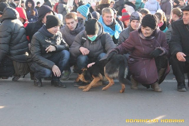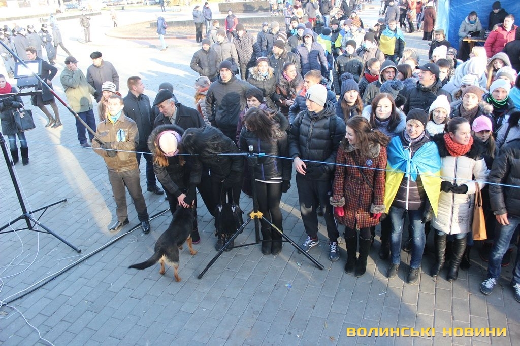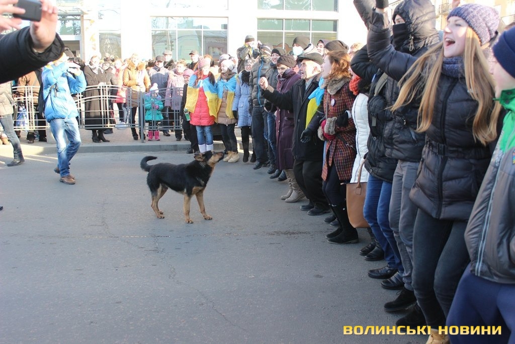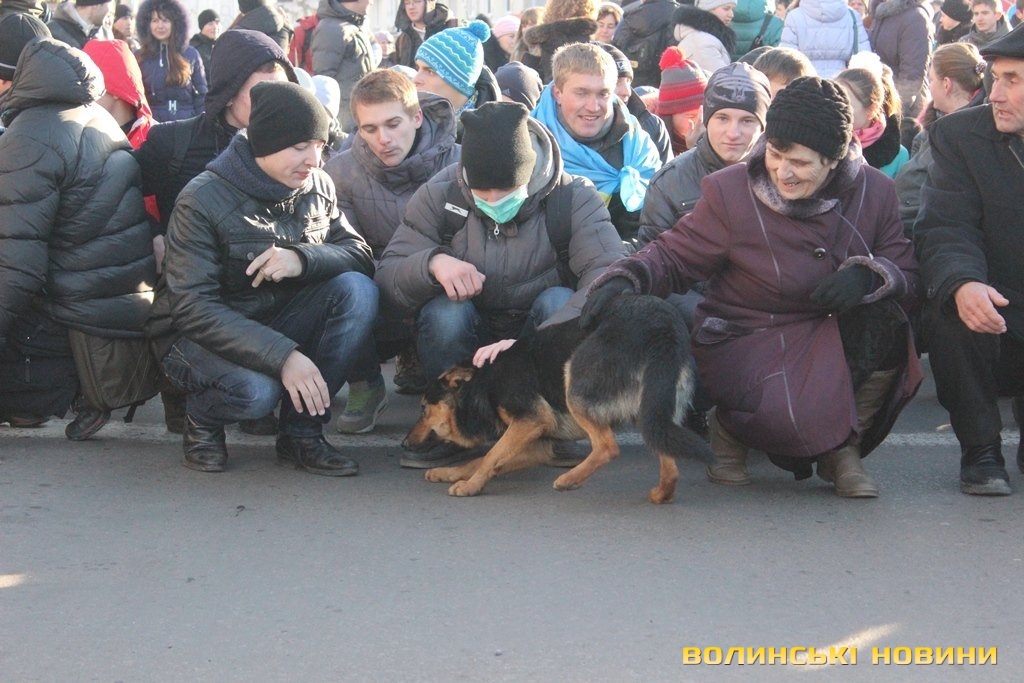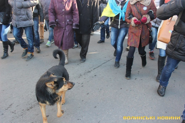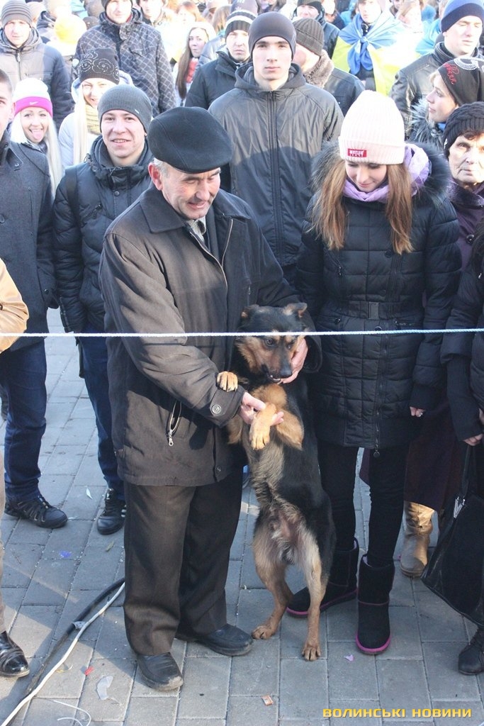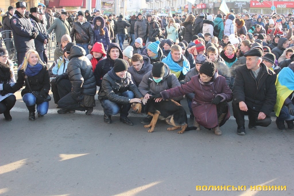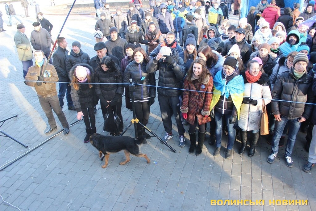 На нього кажуть просто «Пес», адже у чотирилапого немає клички. Після зняття облоги Волинської обласної ради Пес, очоливши колону протестуючих, почалапав до Театрального майдану. Під час ходи собака підбігав до усіх, щоб почухали за вушком, і погавкував, коли вигукували гасла. Та й на цьому його консолідація з революціонерами не завершилася: коли учасники ходи зупинилися навпроти центрального універмагу для традиційного флешмобу – собака почав разом з усіма сідати і під гасло «Хто не скаче – той москаль» гавкати та стрибати.Мітингувальник Жора Потапчук пригадує, що сьогодні уночі бачив собаку біля палаток на Театральному майдані, як пес опинився біля обласної ради - не знає.