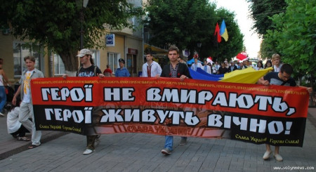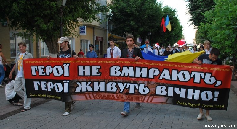Дорогою учасники маршу вигукували гасла штибу «Серп і молот – смерть і голод», «Герої не вмирають! Вмирають вороги!»