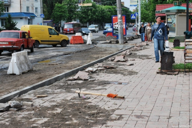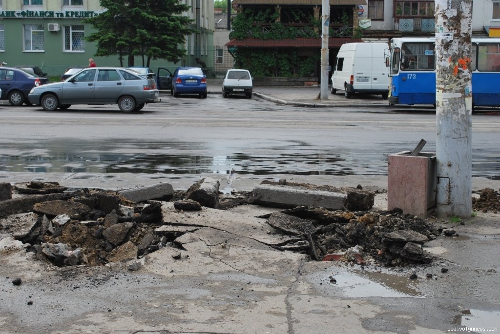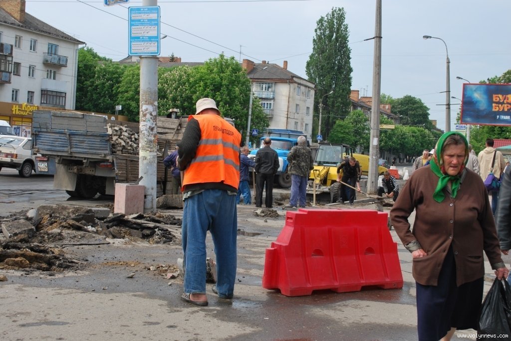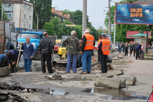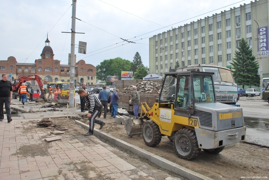 Посадовець пояснив, що наразі працівники фірми-підрядника ТзОВ «Луцькавтодор-сервіс» знімають старі бордюри. Однак, як з’ясувалося, знімають будівельники й частину бруківки, розбивають асфальт і розширюють дорогу навпроти приміщення відділення «Приватбанку».