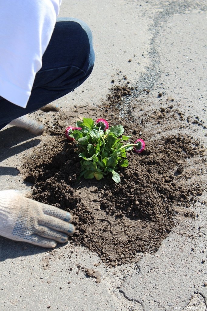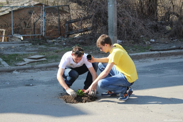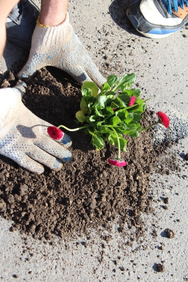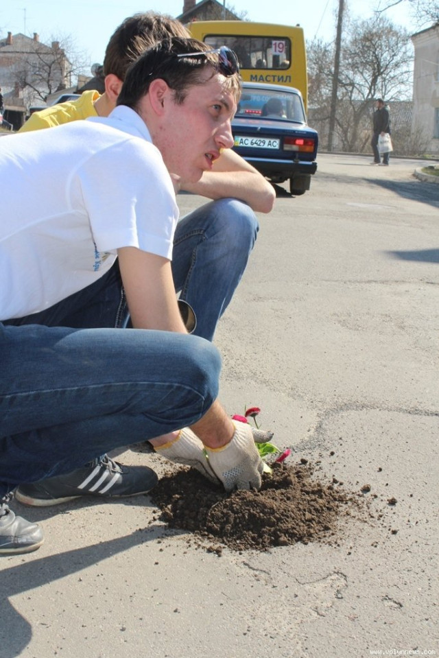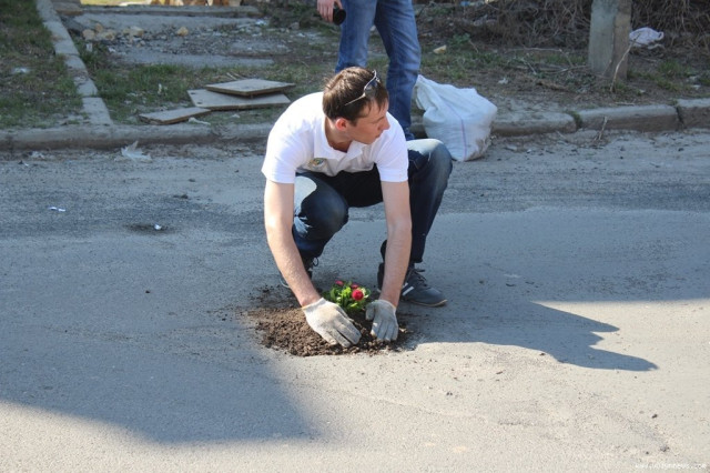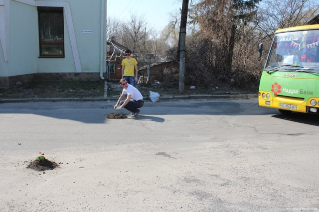 Тож, приступивши до роботи, молодим рухівцям вдалося «ліквідувати» приблизно півдесятка ям. Хлопці садили в них квіти, навіть не зважаючи на рух транспорту. Деякі водії об'їжджали своїми автомобілями імпровізовані клумби, а от один із автомобілістів на маршрутному таксі в’їхав якраз посередині «полатаної» квітами ями. І хоч активісти відразу ж «реанімували» клумбу, та доля решти до кінця сьогоднішнього дня – під знаком запитання.