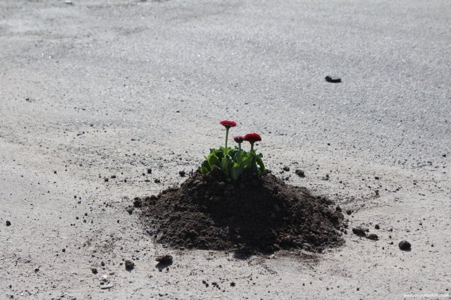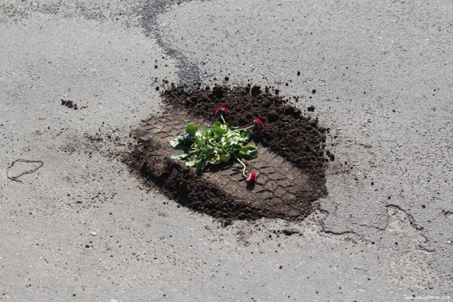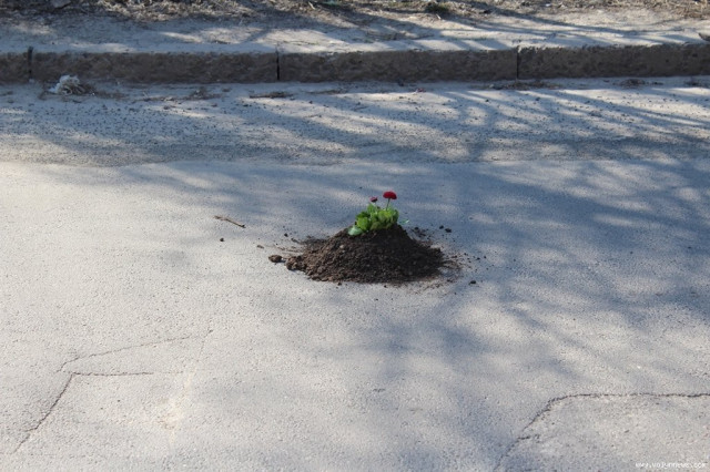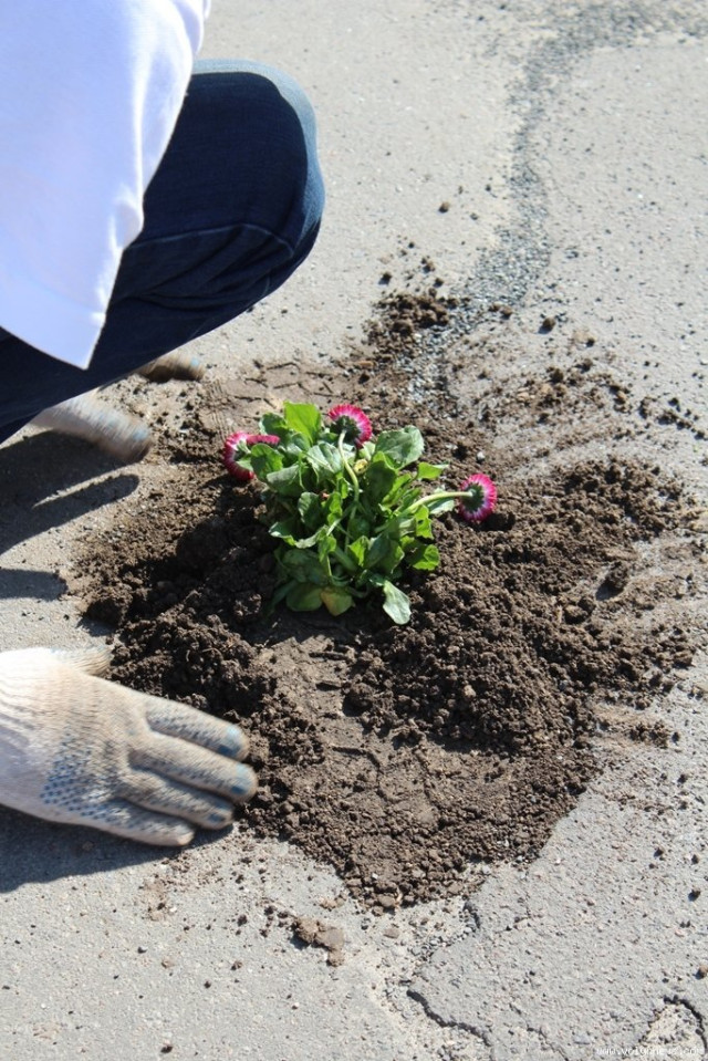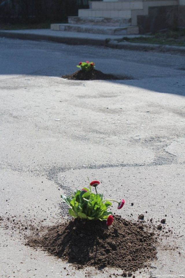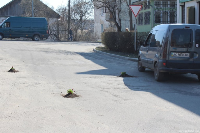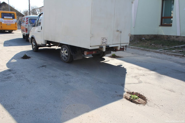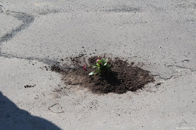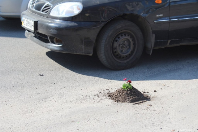 Із проблемою жахливого стану доріг вирішили боротися у своєрідний спосіб: висаджуючи квіти у ями на проїжджій частині. Та один з луцьких водіїв не «оцінив» цієї ініціативи і відразу ж переїхав квітку.